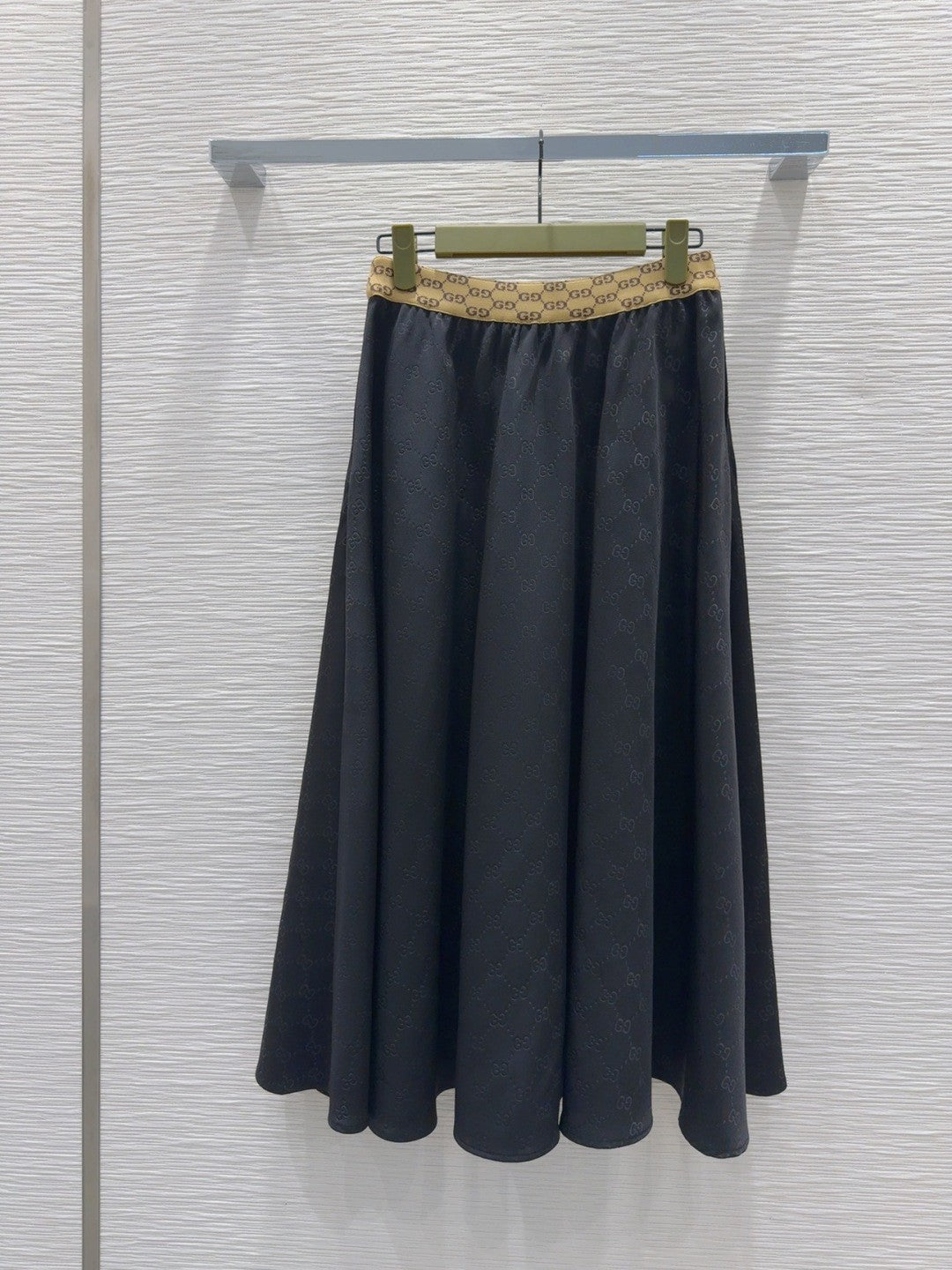 The skirt is made from 100% polyester, ensuring a smooth, luxurious feel and a flattering drape. The body of the skirt features an understated yet elegant black base adorned with the iconic Gucci logo jacquard pattern, a subtle nod to the brand's heritage that exudes sophistication.