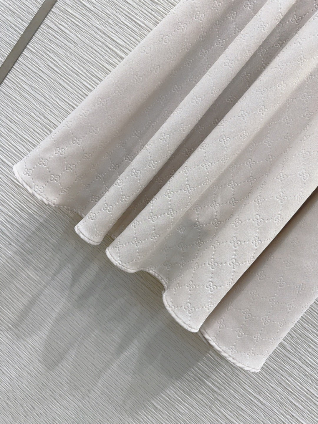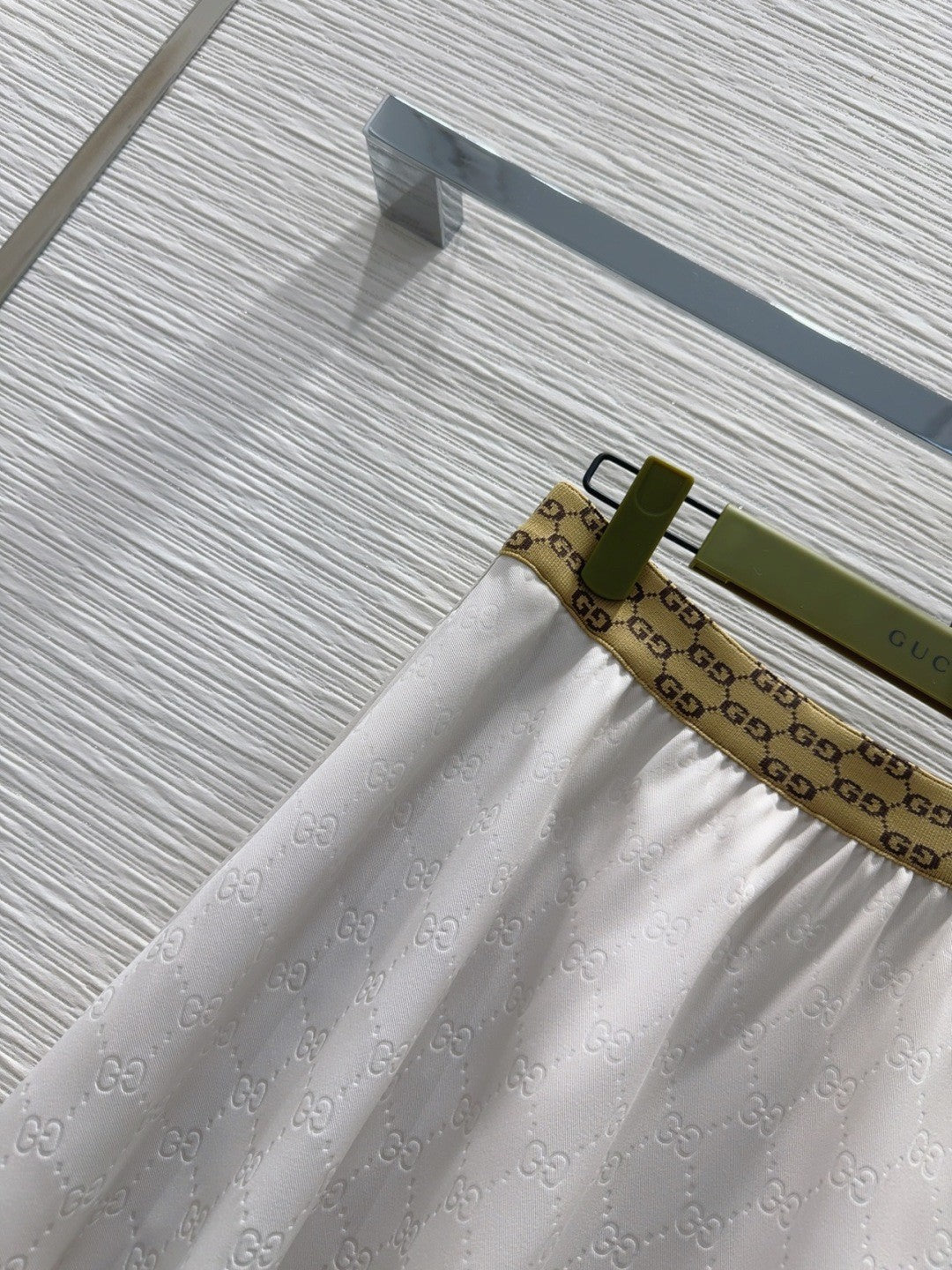 The skirt is made from 100% polyester, ensuring a smooth, luxurious feel and a flattering drape. The body of the skirt features an understated yet elegant White base adorned with the iconic Gucci logo jacquard pattern, a subtle nod to the brand's heritage that exudes sophistication.
