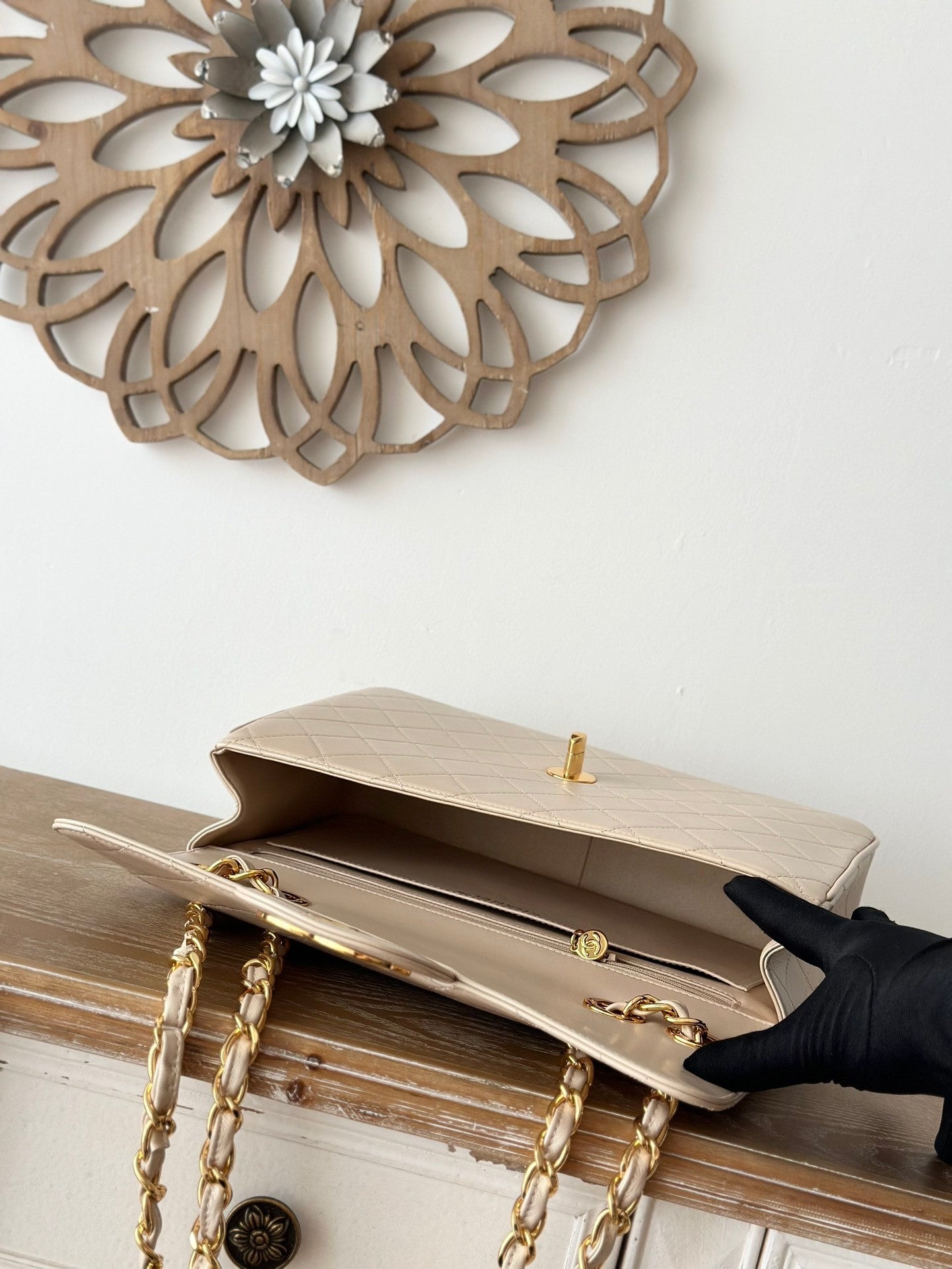 The large, eye - catching gold - plated logo stands out against the sleek beige lambskin surface, adding a touch of opulence. This design element, a nod to Chanel's storied past, makes the bag a true statement piece.