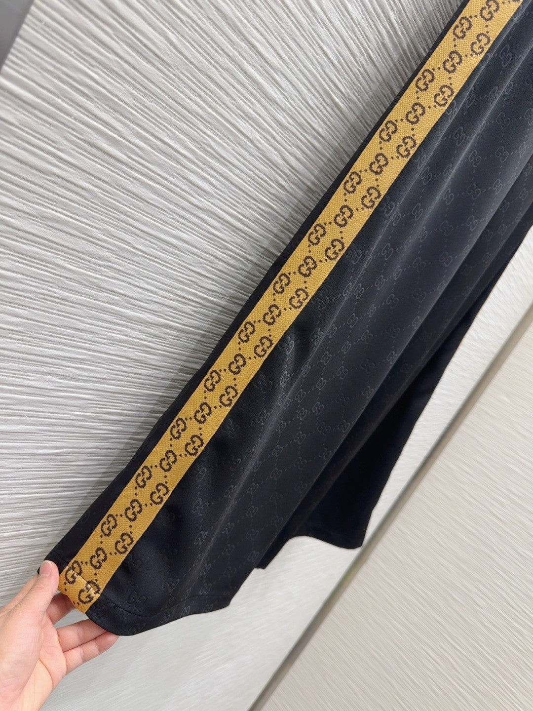 Crafted from 100% polyester, these trousers offer a smooth and luxurious feel. The body of the trousers features an elegant Black base adorned with a subtle Gucci logo print, exuding understated sophistication. The waistband and side stripes are the true showstoppers, showcasing Gucci's iconic monogram pattern in a rich, contrasting color. This not only adds a bold statement element but also pays homage to the brand's heritage.
