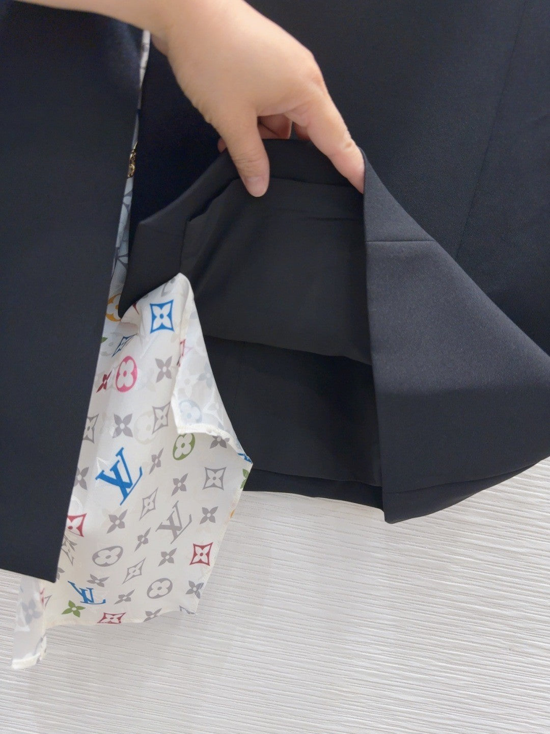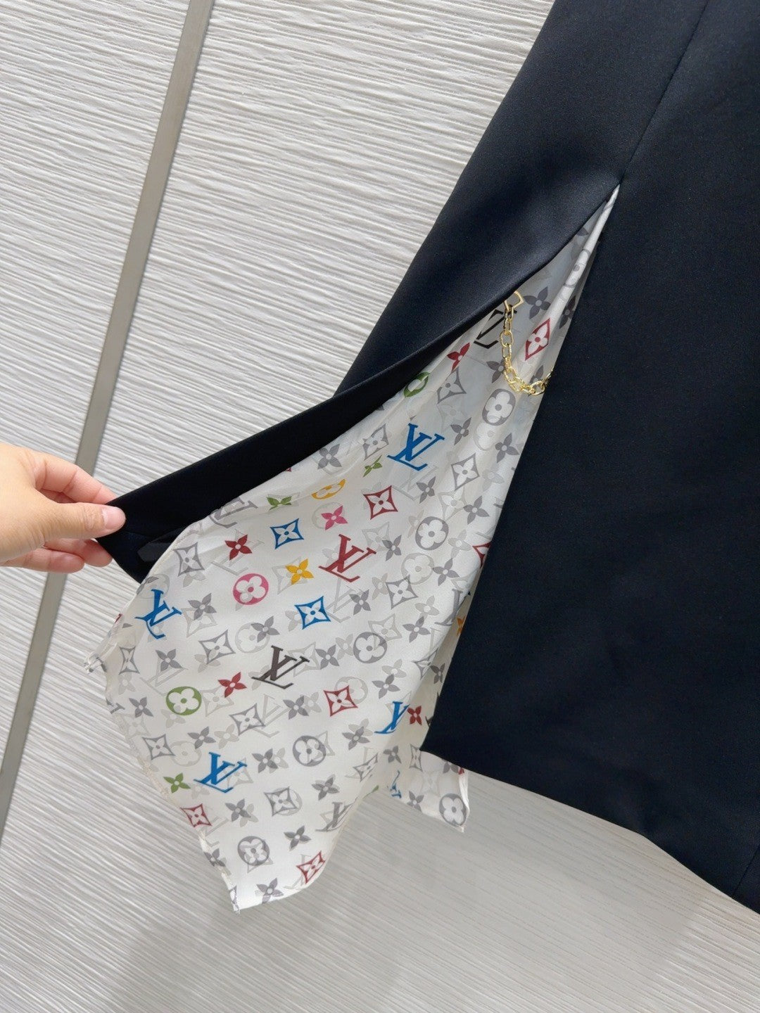 The true highlight lies in the side slit, revealing a vibrant lining adorned with the iconic Louis Vuitton monogram pattern. The colorful monogram adds a pop of luxury and instantly recognizable brand identity, juxtaposed against the sleek black exterior for a striking contrast. The back features a hidden zipper for a seamless finish, enhancing the dress's streamlined aesthetic.