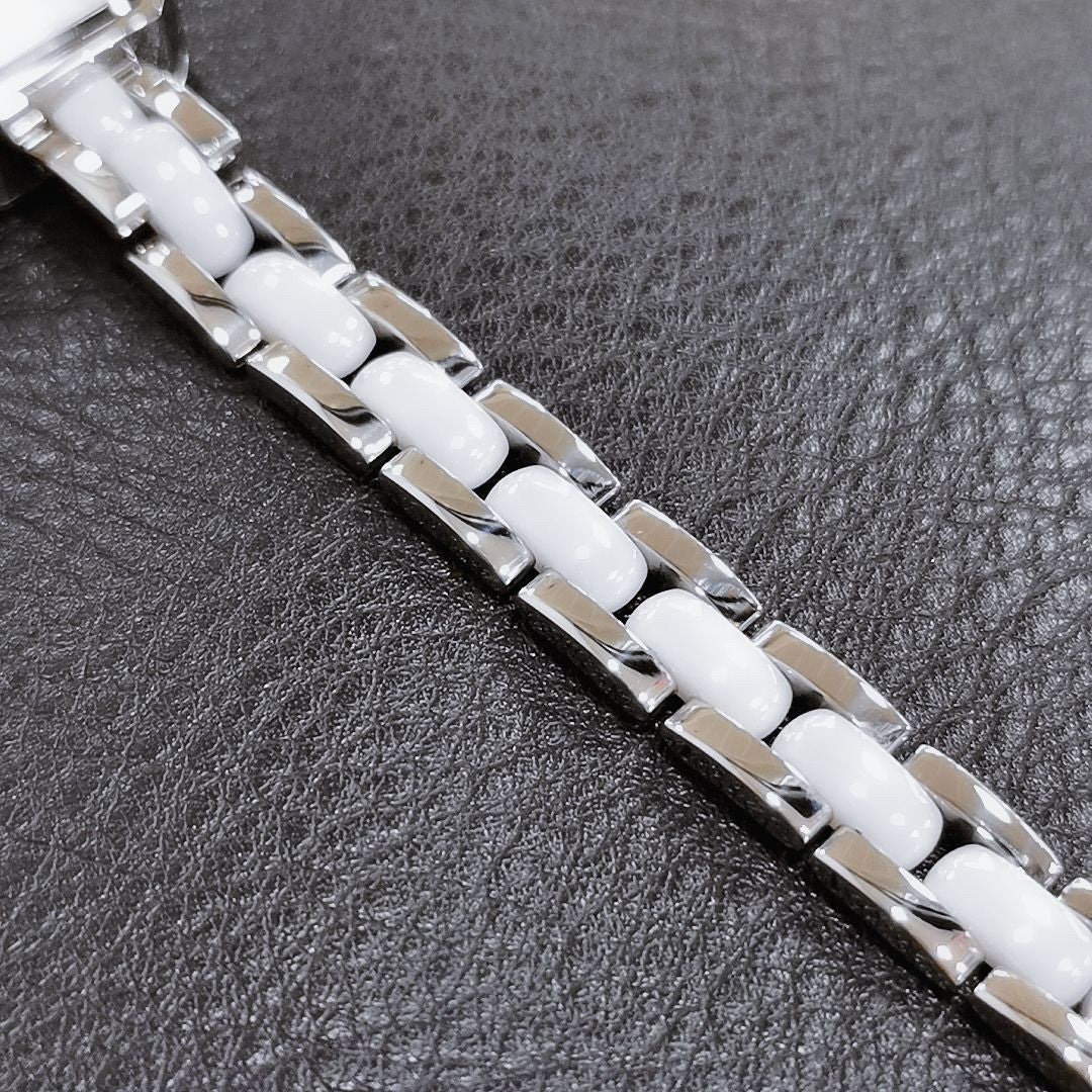 The bracelet, a seamless blend of white ceramic and polished metal links, offers a comfortable and secure fit. It not only complements the case but also adds a modern, stylish edge.