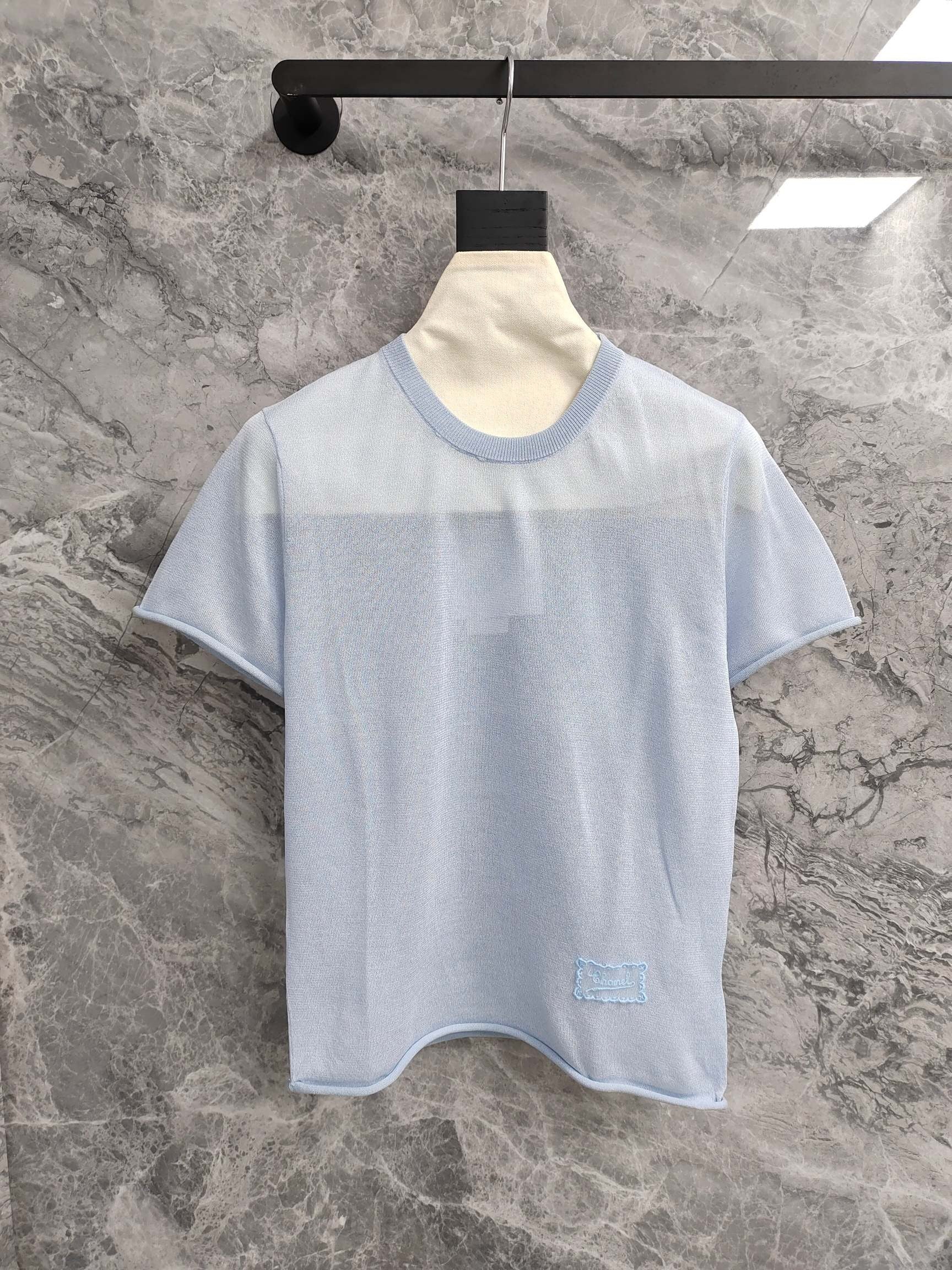 This top showcases a soft, pastel blue hue that exudes femininity and sophistication. The short - sleeved design is perfect for warmer days, while the round neckline adds a touch of classic charm. The knit fabric features a delicate texture, giving it a refined and luxurious appearance. A subtle Chanel logo patch on the front adds a signature detail, instantly elevating the piece and reflecting the brand's heritage.