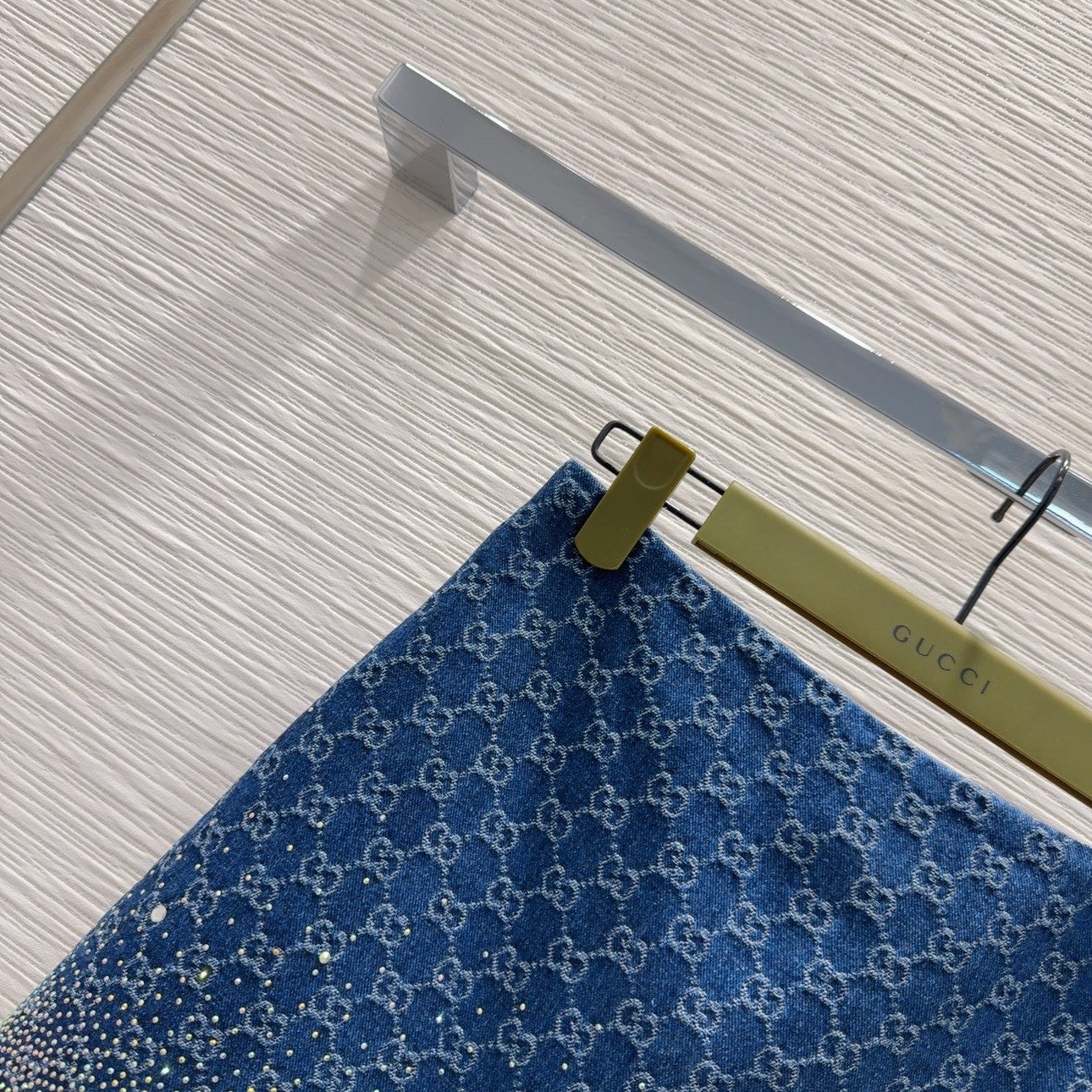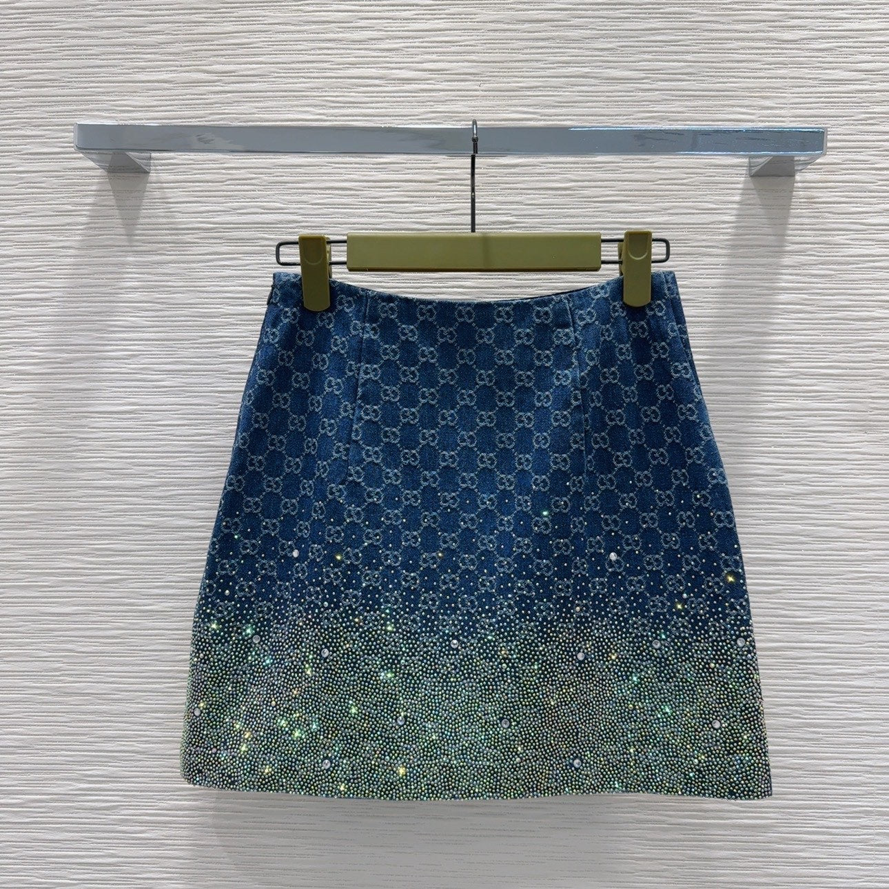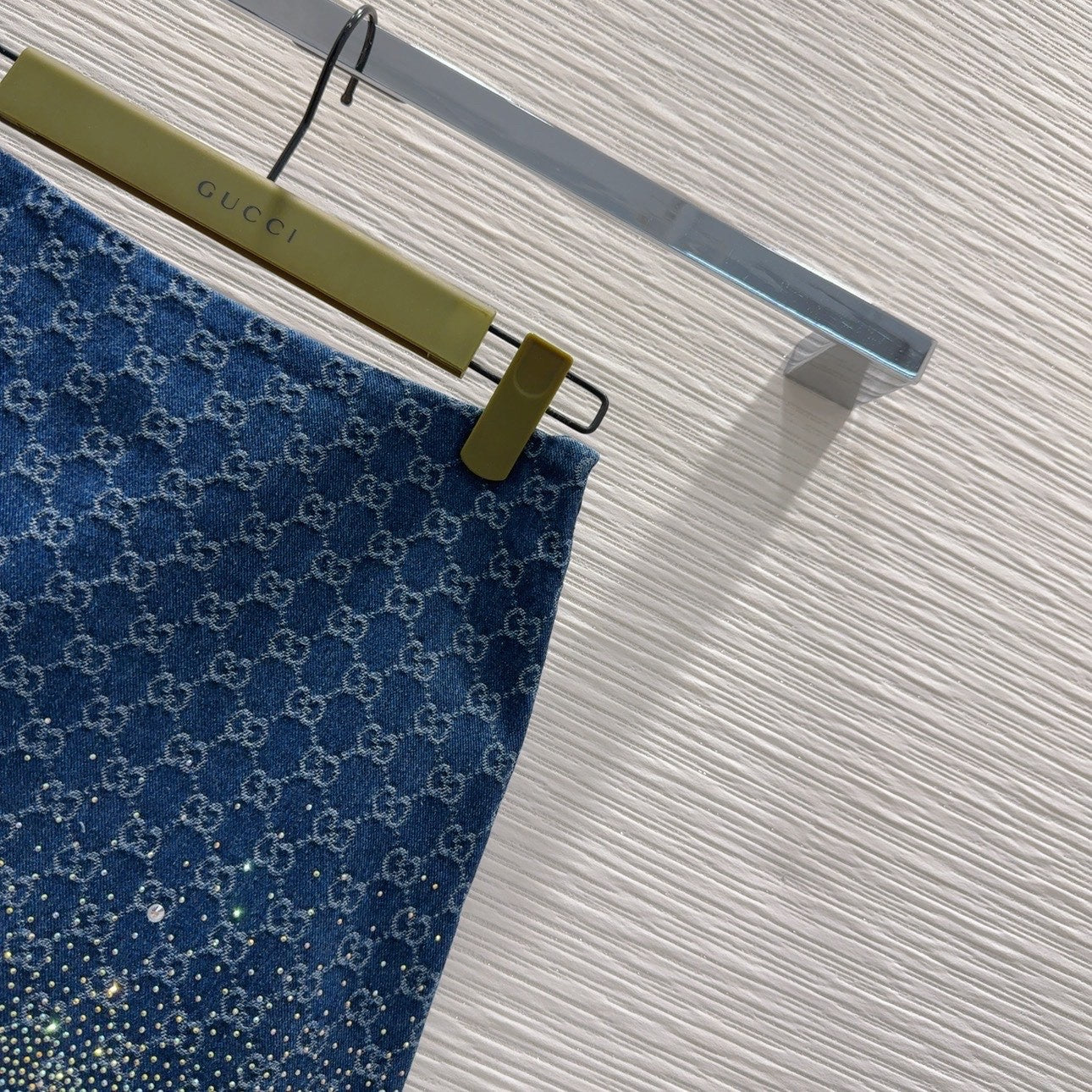 Adorned with high - quality heat - set rhinestones, the skirt sparkles elegantly, adding a touch of glamour. The iconic Gucci pattern is intricately woven into the denim fabric, showcasing the brand's classic style.
