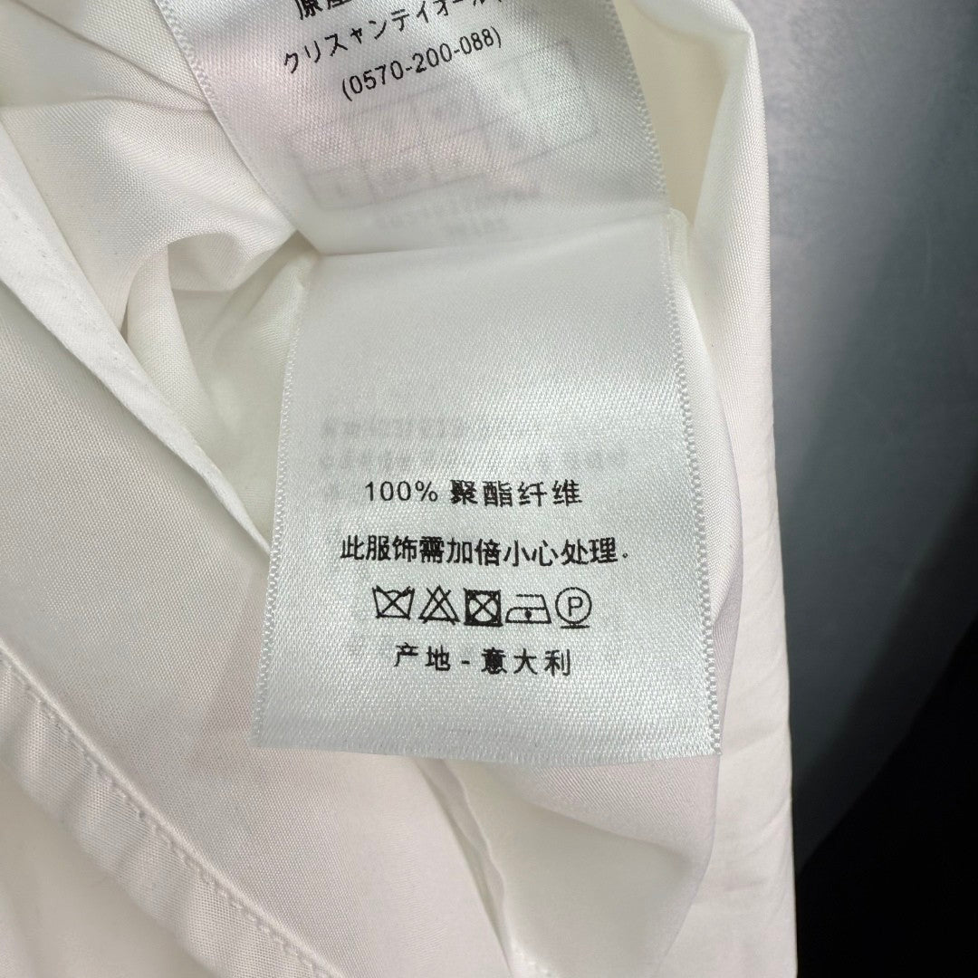 The cinched waist is a standout feature, accentuating your curves and adding a feminine charm. It flows into a gently flared skirt, providing a graceful drape that moves beautifully with every step. Embroidered on the side is the iconic Dior bee logo, a symbol of the brand's heritage and craftsmanship, adding a subtle yet distinctive touch of luxury.