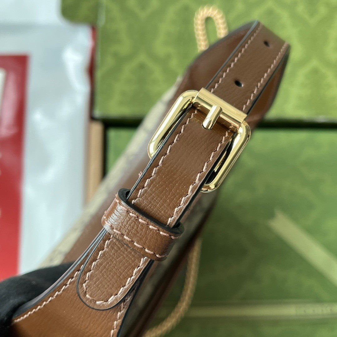Introducing this stunning GUCCI mini hobo bag, a true icon of luxury and style. The bag showcases the brand's signature GG monogram canvas, a timeless pattern that exudes sophistication and heritage. Rich brown leather trims elegantly frame the canvas, adding a touch of warmth and contrast.