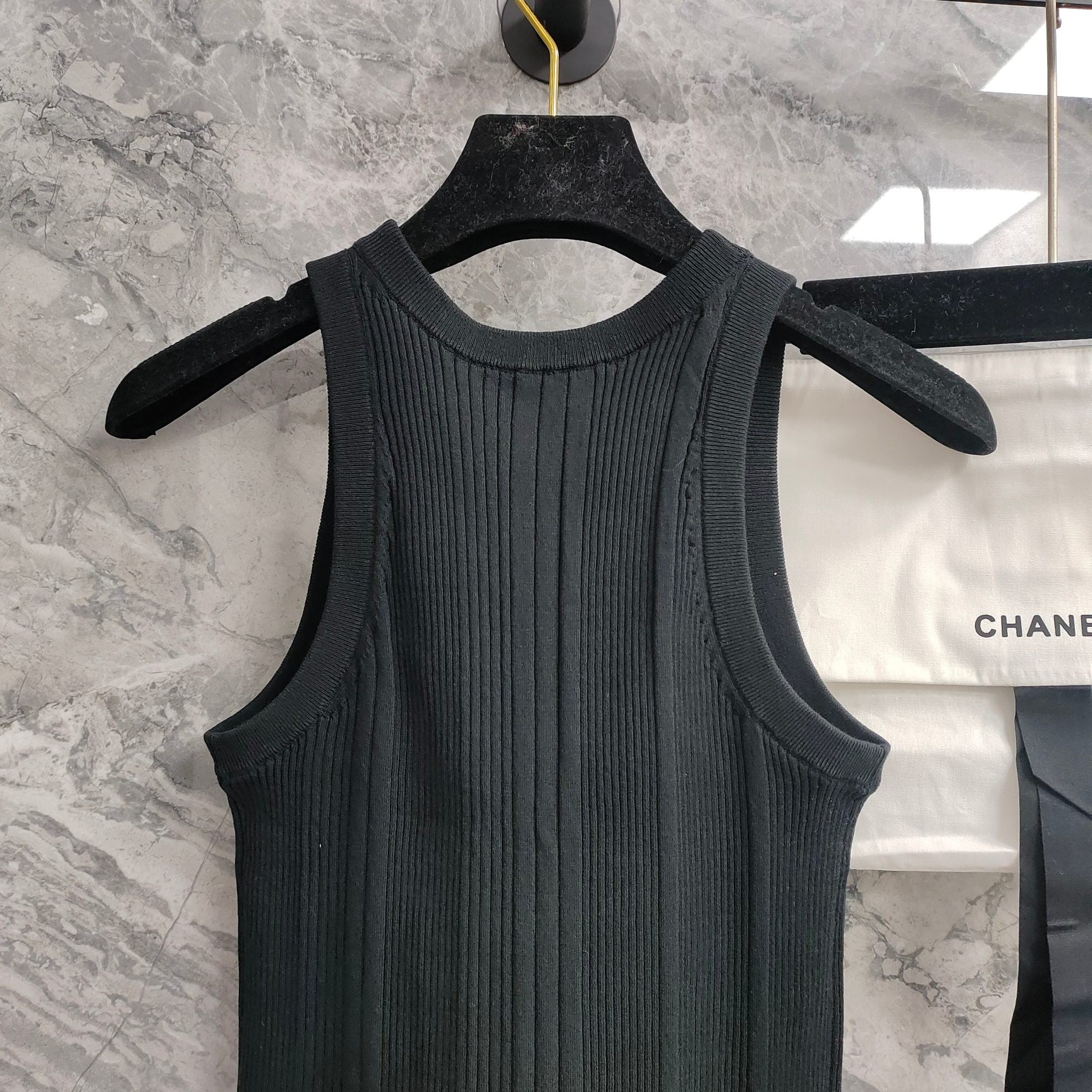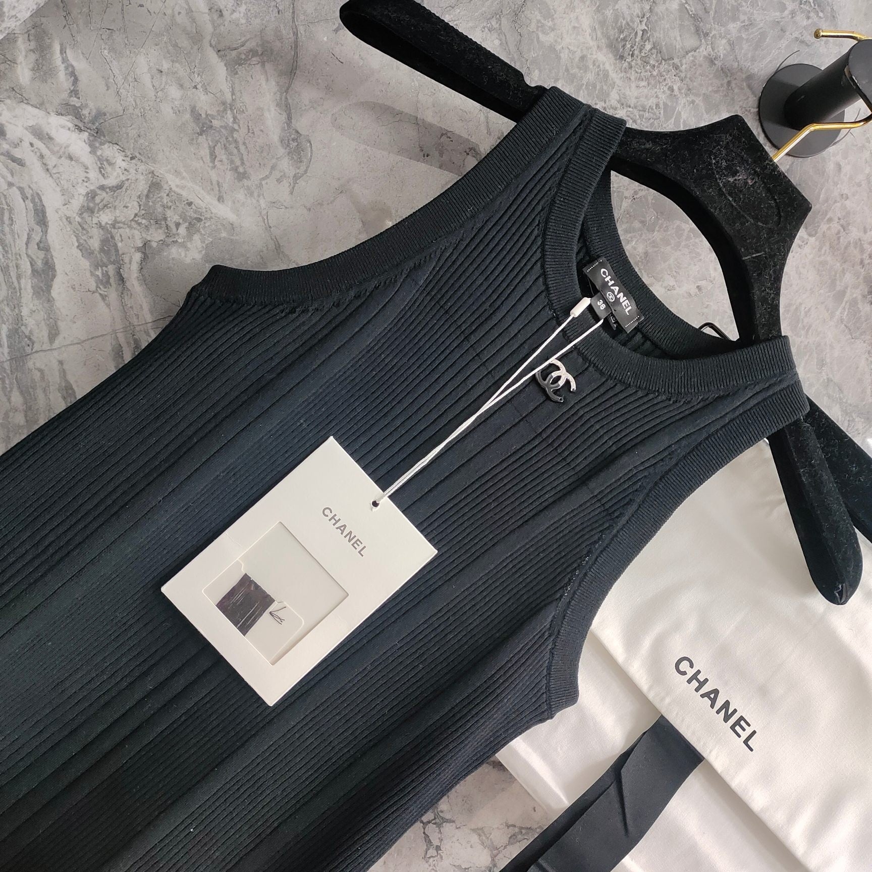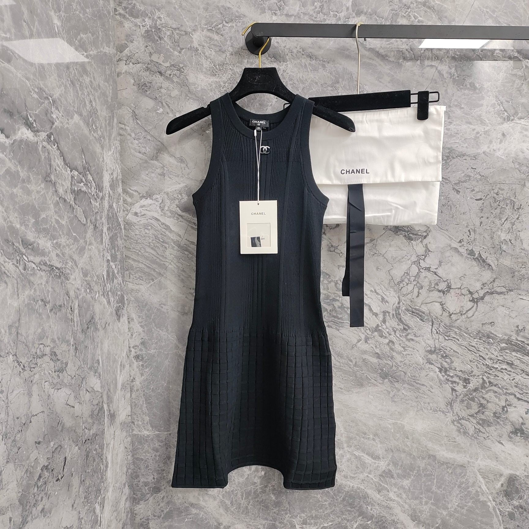 Perfect for a range of occasions, from a chic daytime event to an elegant evening gathering. Pair it with Chanel's iconic accessories, such as classic pumps and a quilted handbag, to complete a look that is both timeless and on - trend. Owning this Chanel sleeveless ribbed knit dress means embracing a legacy of style and sophistication.
