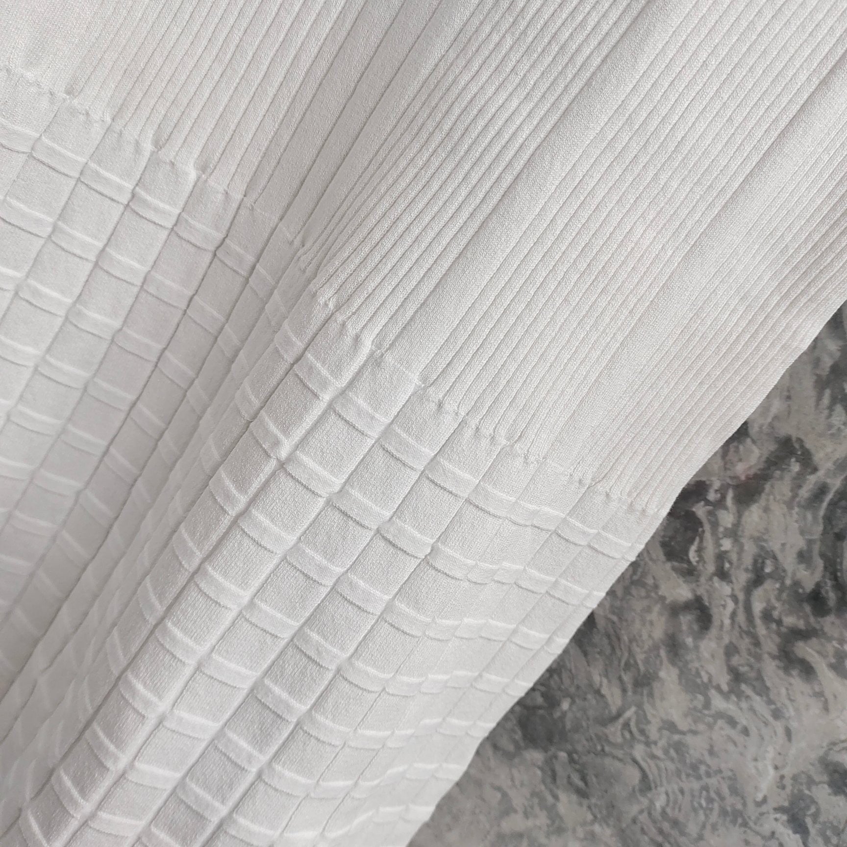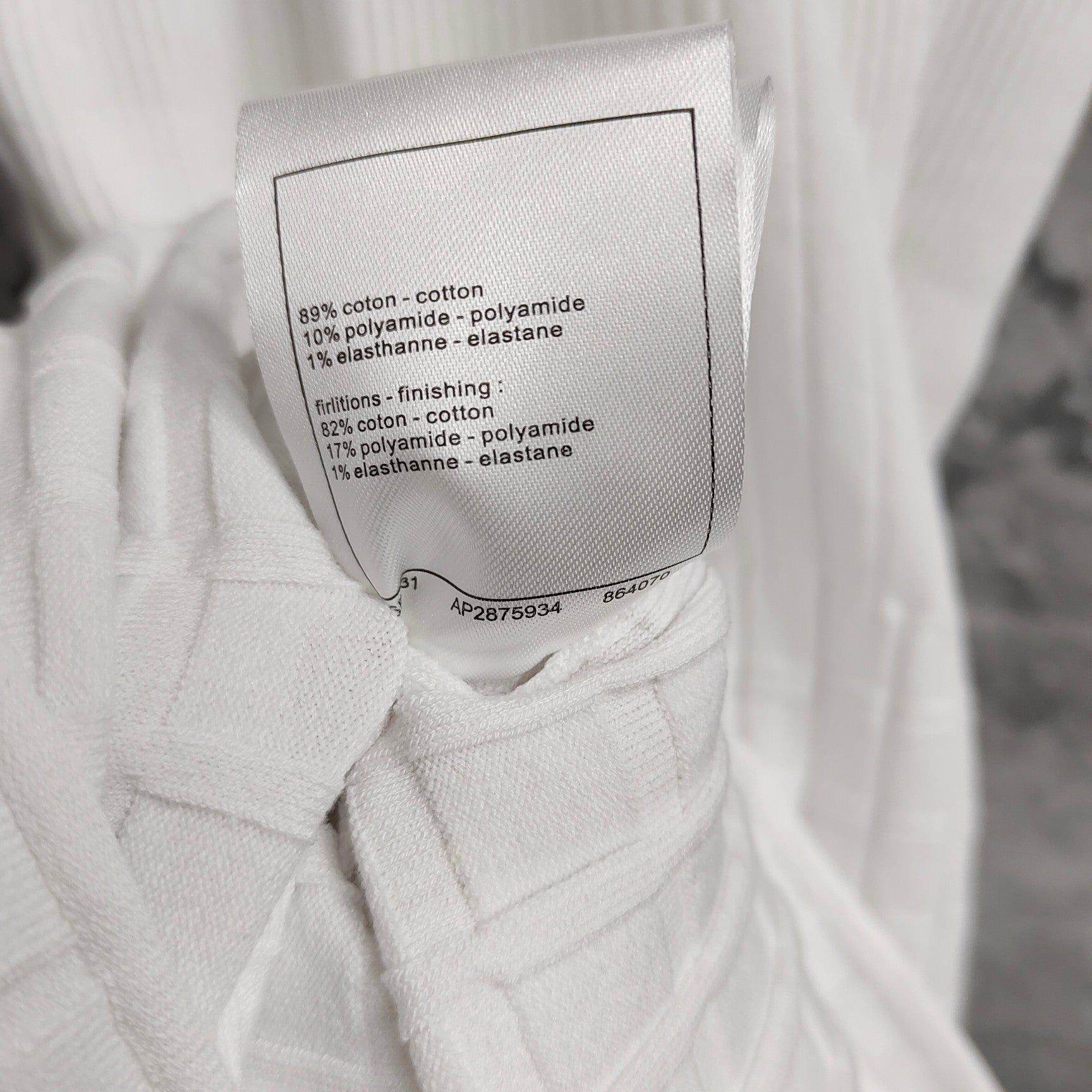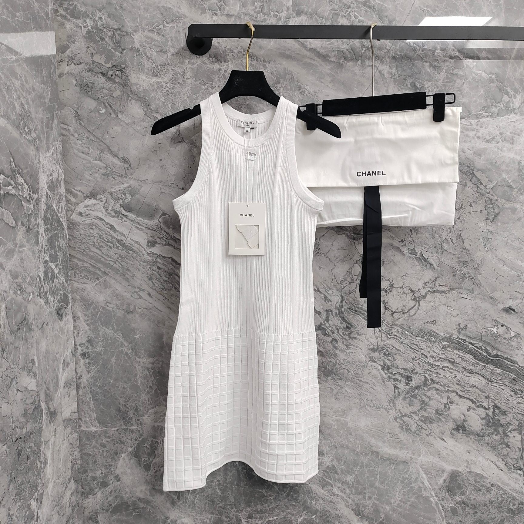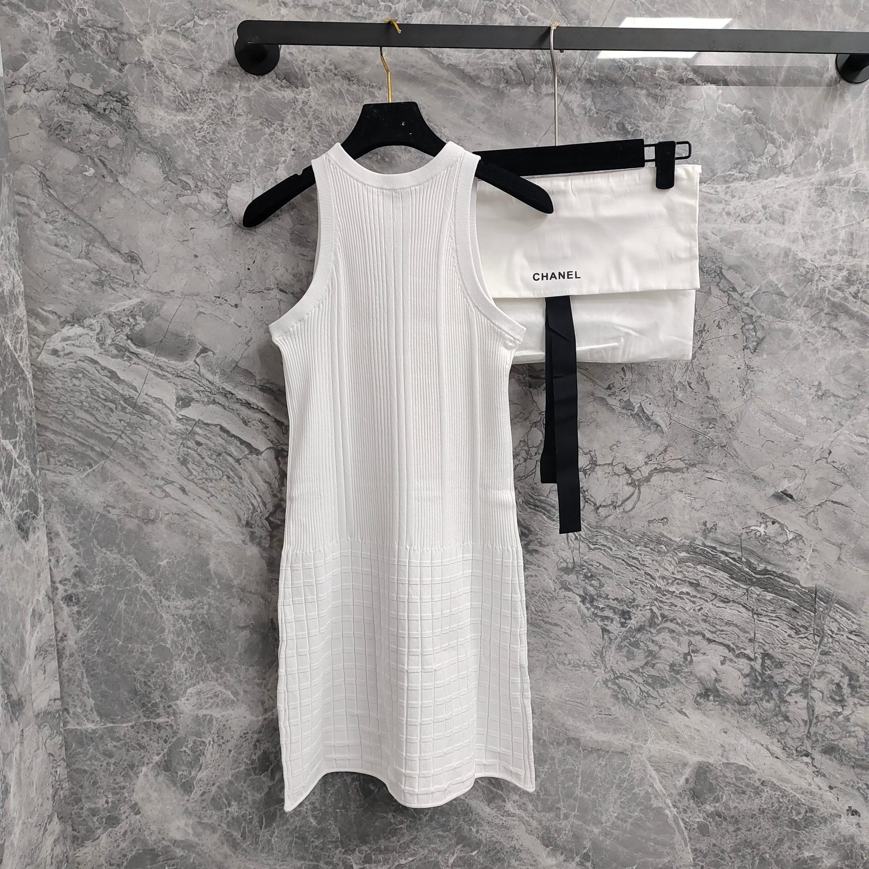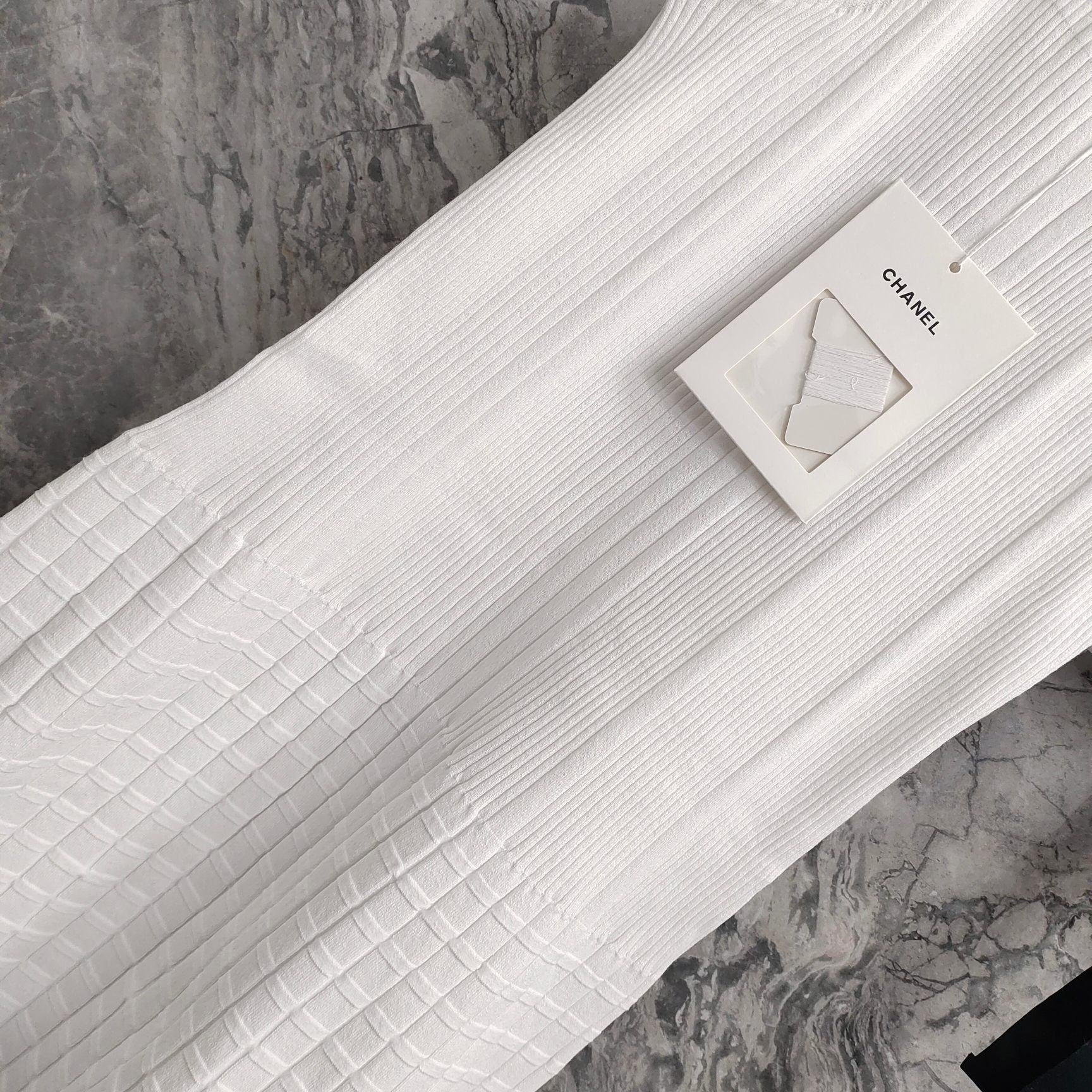 The round neckline is a nod to Chanel's classic aesthetic, exuding understated elegance. The seamless construction and fine knit not only offer a comfortable fit but also highlight the wearer's poise. The transition from the ribbed pattern on the bodice to the distinct pattern on the skirt adds a subtle yet striking visual contrast, making this dress a work of art.