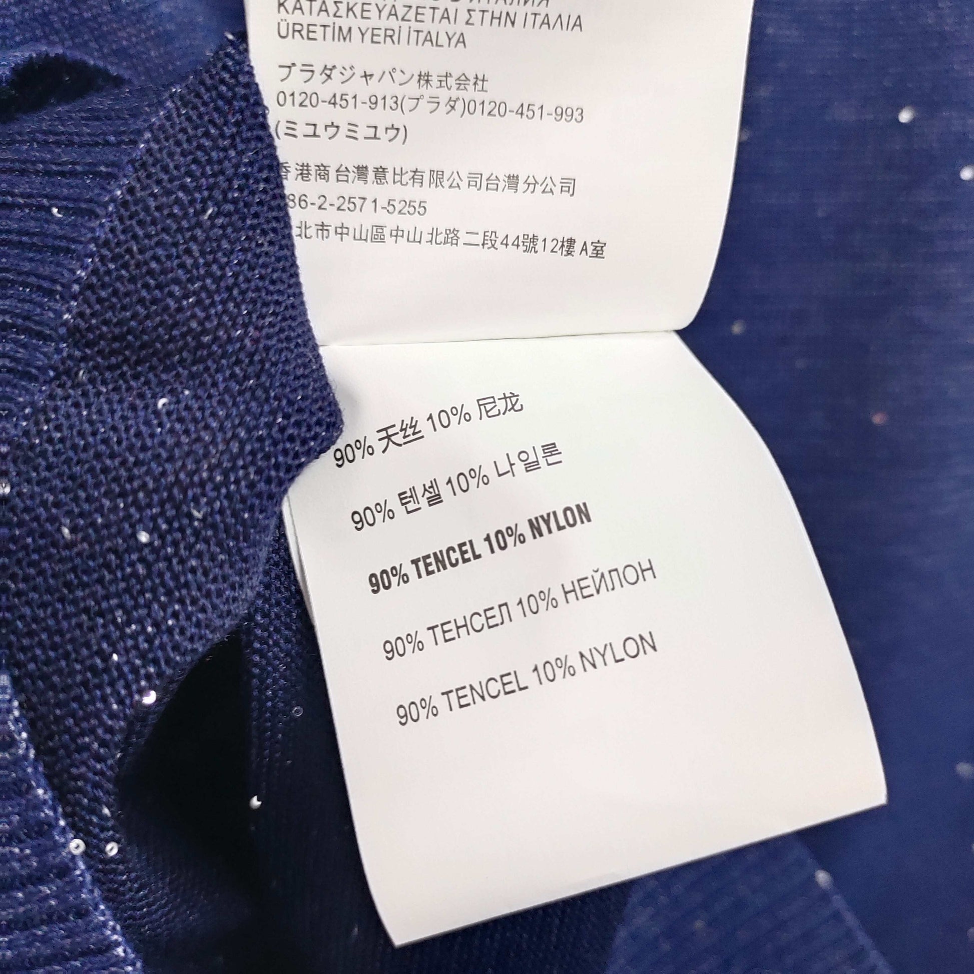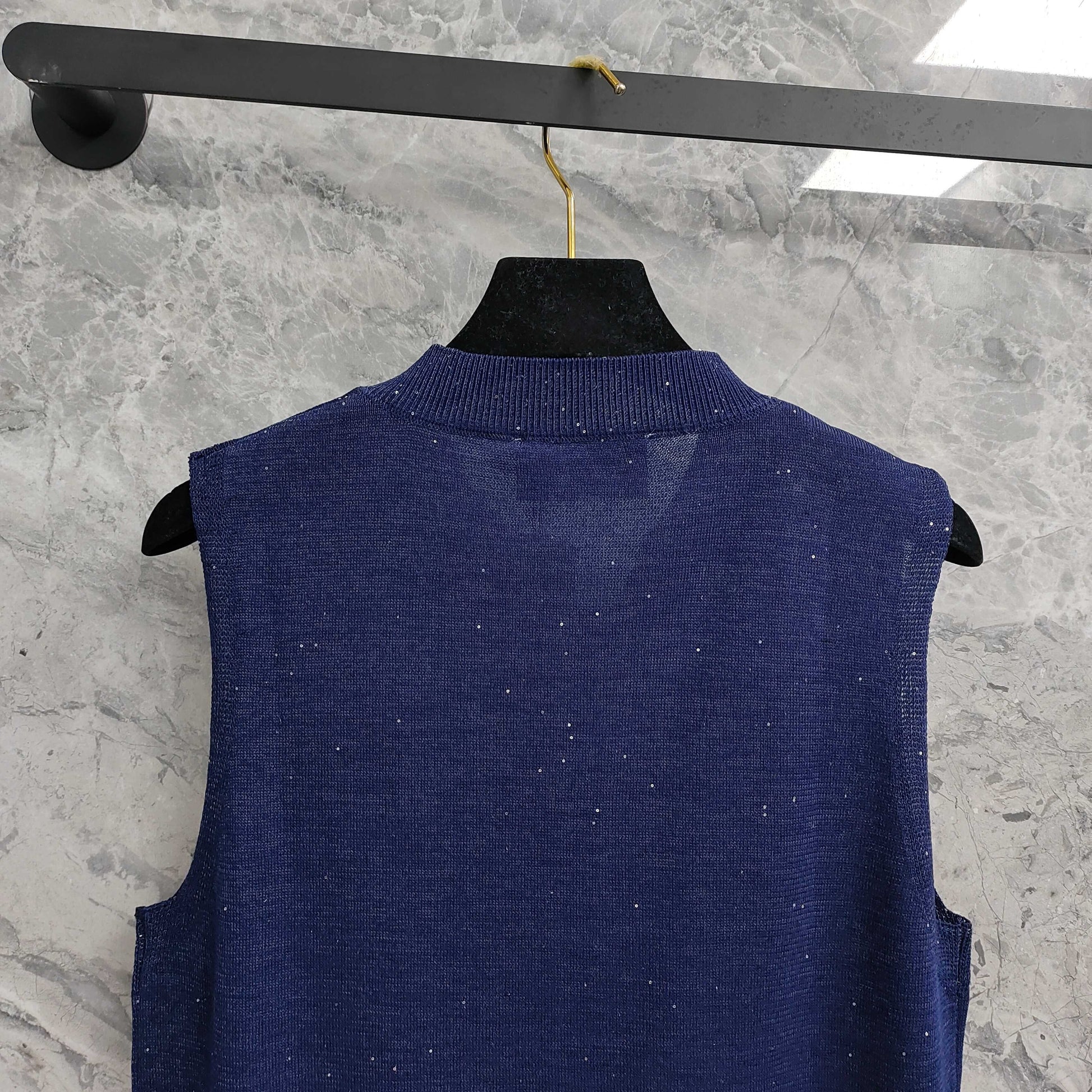 This vest showcases a rich navy blue hue, exuding a sense of refinement and sophistication. The sleeveless cut offers a modern, versatile look, perfect for layering over shirts or blouses. The knit fabric features subtle embellishments, adding a touch of sparkle and elevating the vest's visual appeal. A signature Prada triangular logo is prominently displayed on the front, instantly recognizable and a testament to the brand's heritage and craftsmanship.