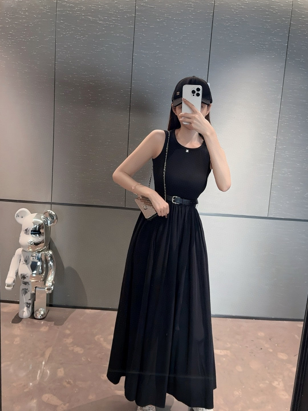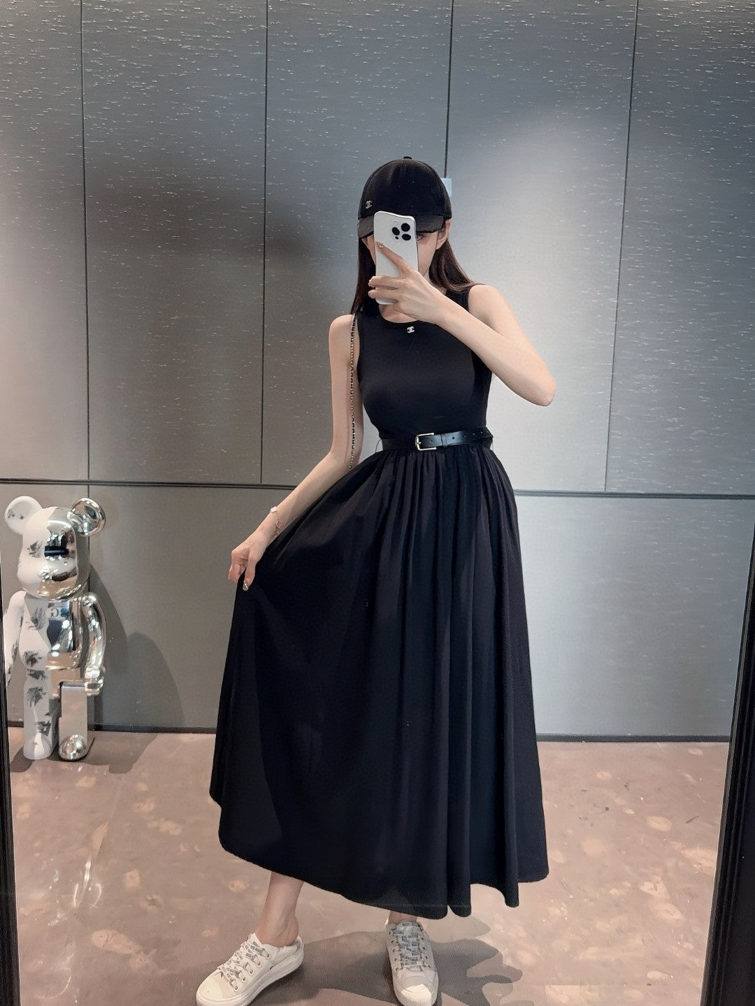 The dress flaunts a classic black hue, a color renowned for exuding understated luxury. It serves as a versatile canvas that can be effortlessly styled for any occasion, be it a casual daytime soiree or a glamorous evening affair. The sleeveless design artfully showcases the wearer's arms, highlighting their grace and elegance. It's a nod to modern minimalism, where simplicity becomes a powerful statement of style.