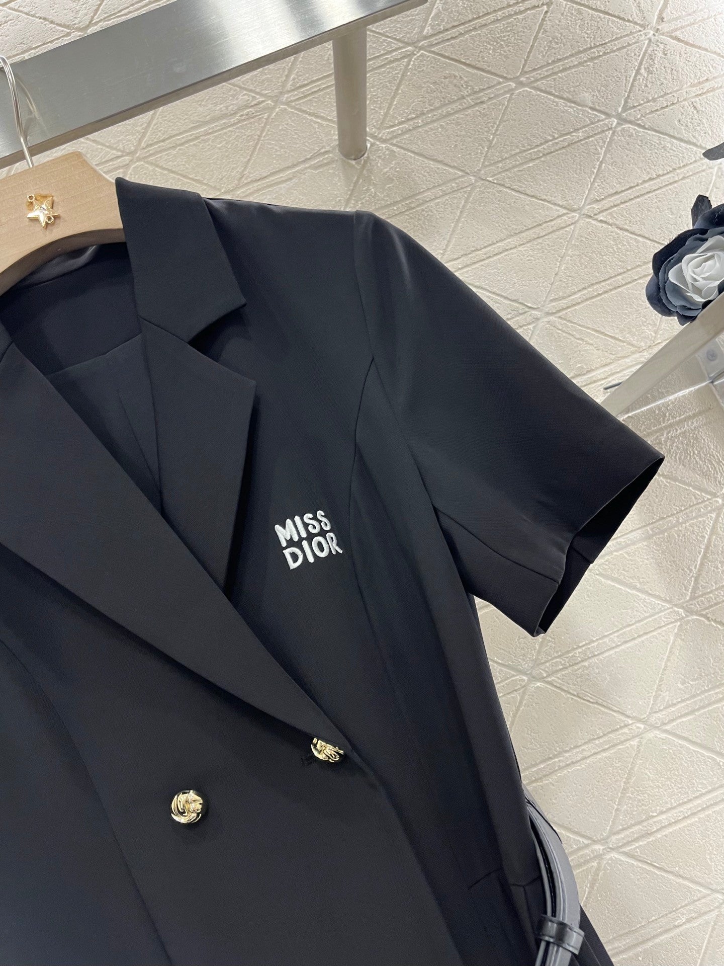 This dress is a testament to Dior's signature style. The short - sleeved blazer - inspired top features a sharp, notched collar and striking double - breasted gold buttons, exuding sophistication and authority. The iconic "Miss Dior" embroidery adds a touch of brand heritage and exclusivity. The pleated skirt flows gracefully, creating a beautiful contrast with the structured top and adding movement to the silhouette. A sleek black leather belt cinches the waist, enhancing your curves and adding a modern edge.