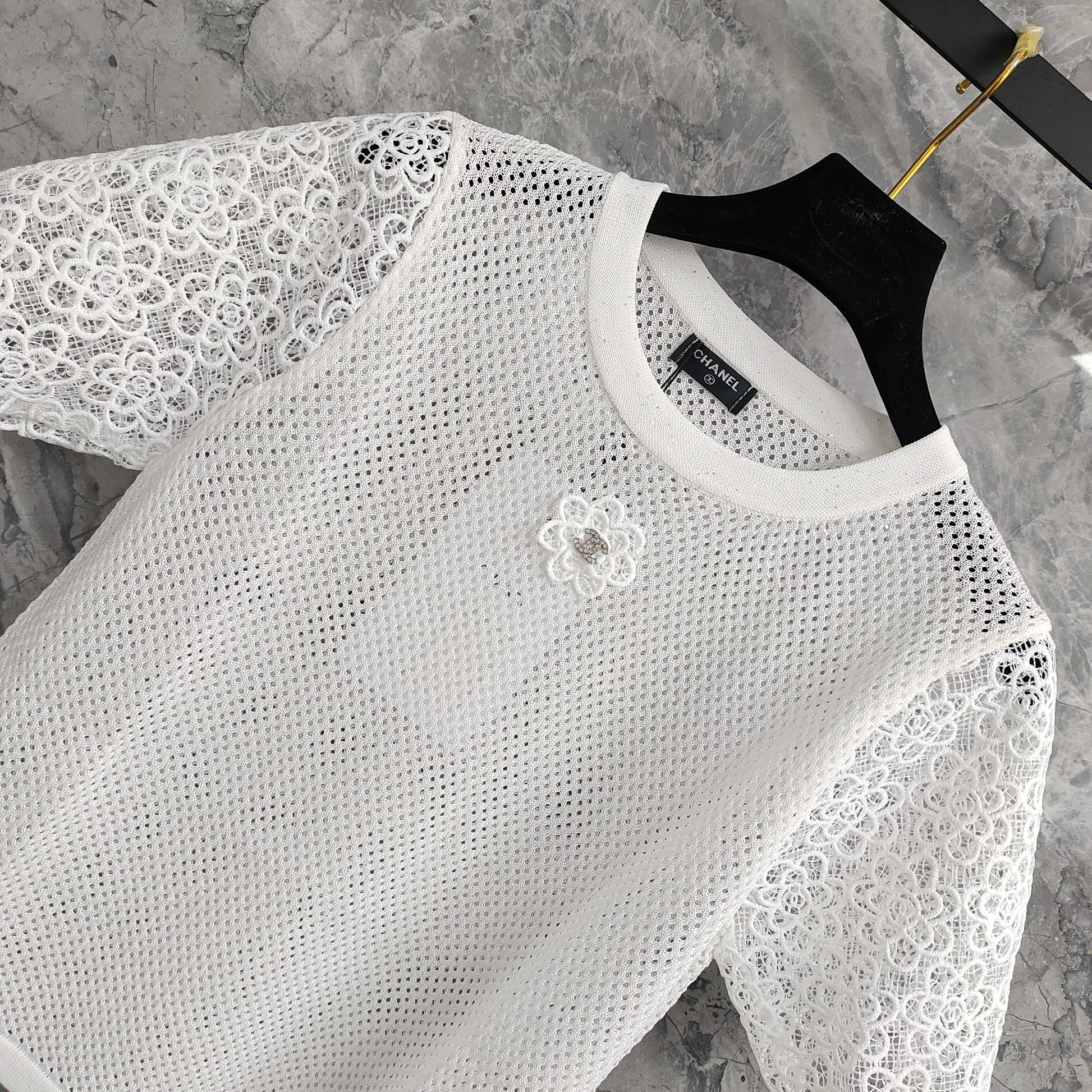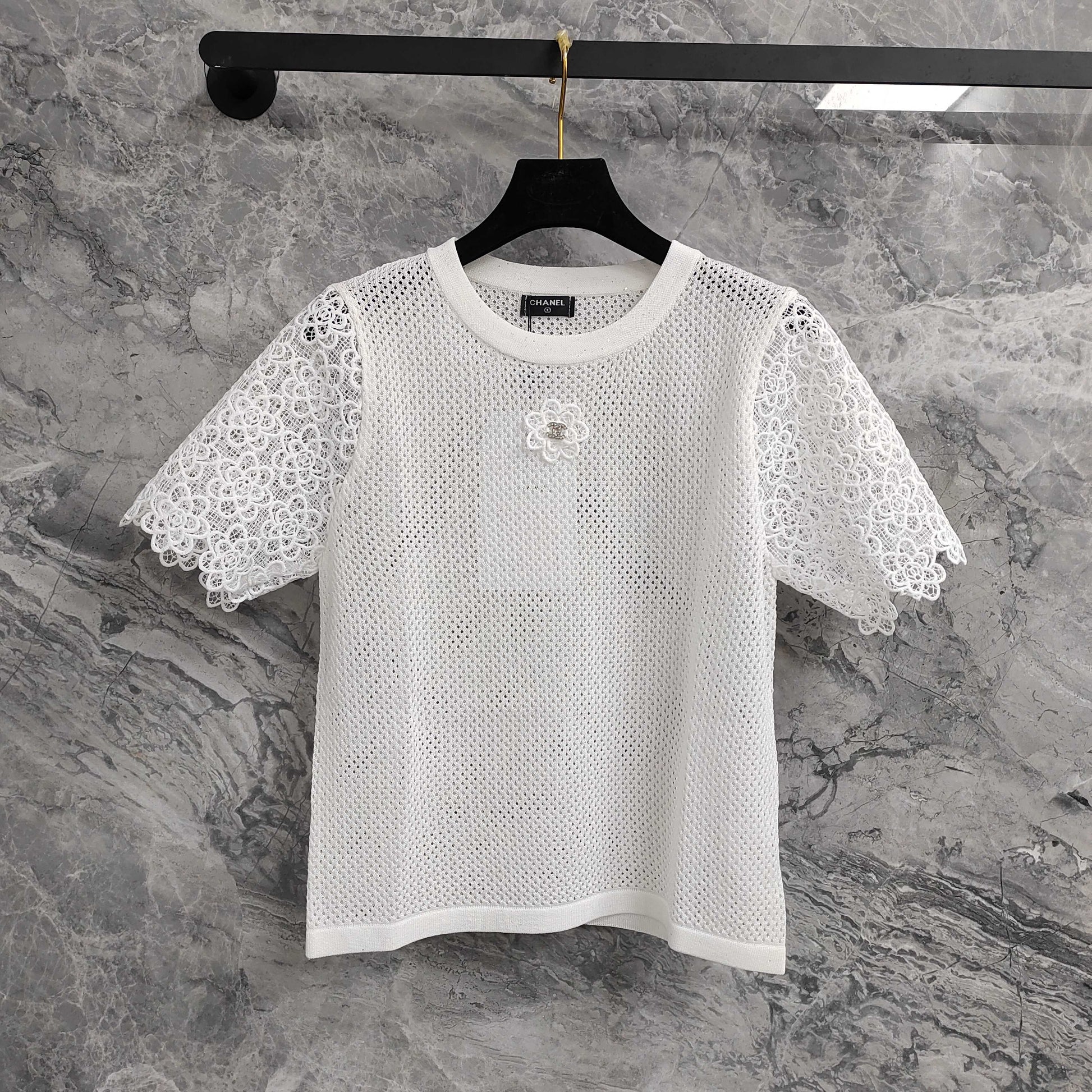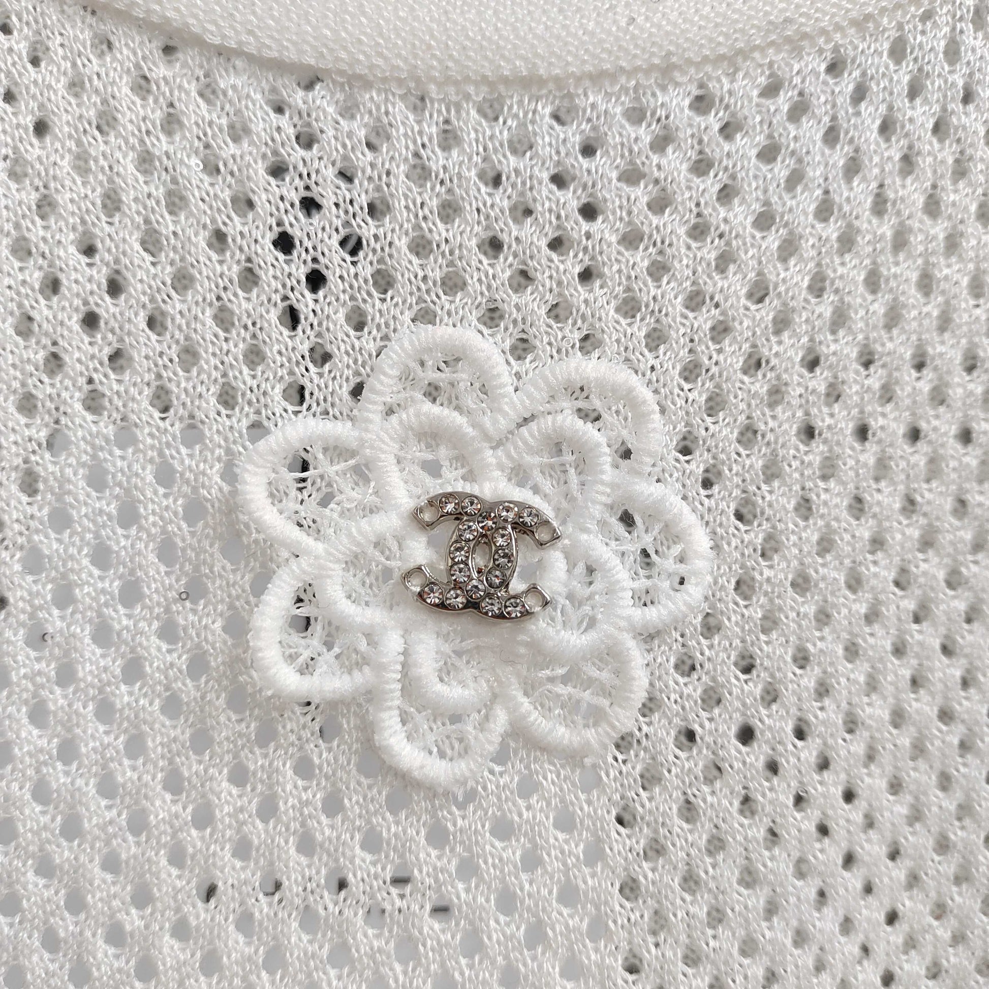 Available in classic black and pristine white, this top is a paragon of Chanel's iconic aesthetic. The mesh fabric offers a delicate, semi - sheer look, exuding an air of understated allure. The short sleeves are adorned with intricate lace trim, featuring an ornate floral pattern that adds a touch of femininity and sophistication. A signature camellia flower embellishment, complete with a sparkling center, graces the chest, paying homage to Chanel's heritage and instantly elevating the piece.