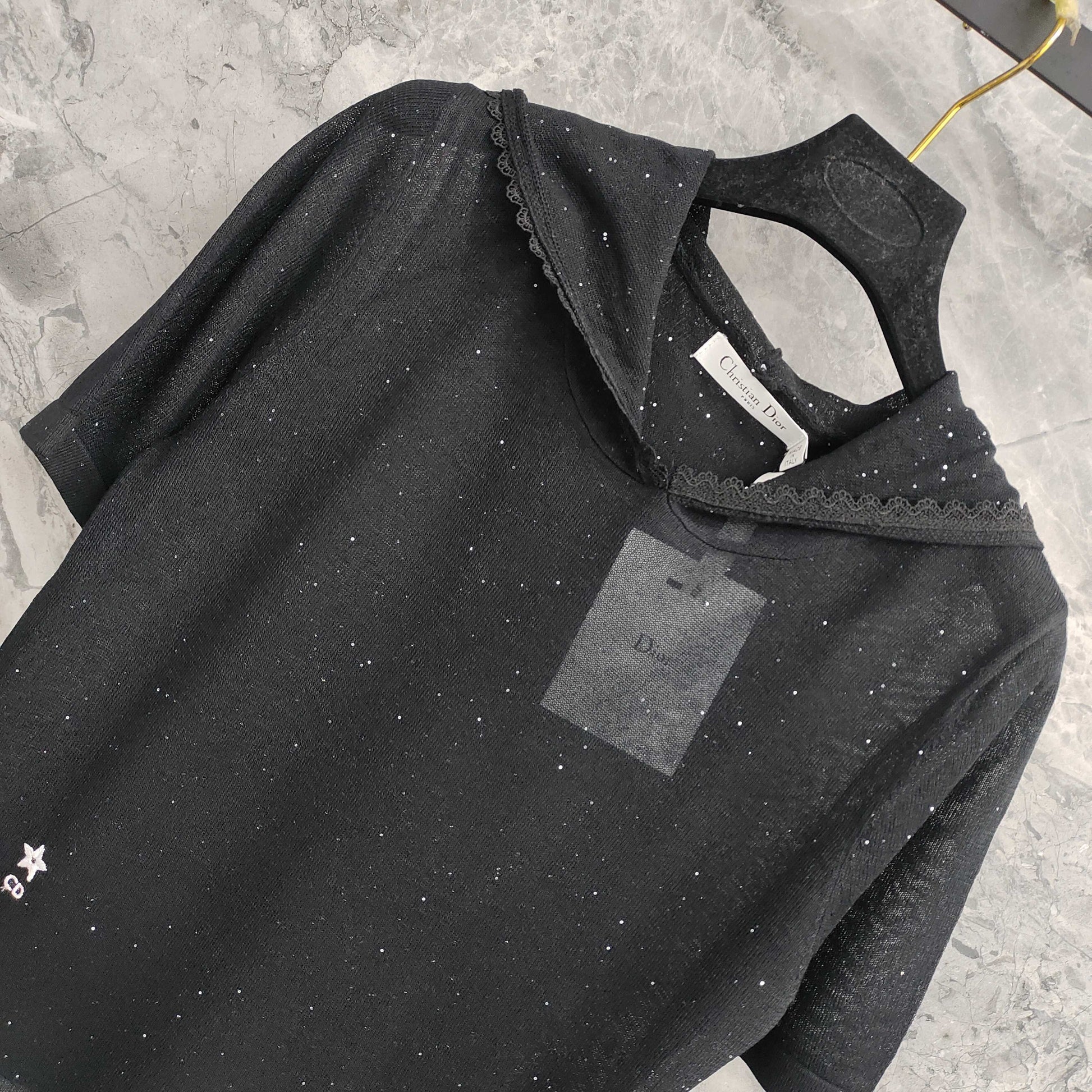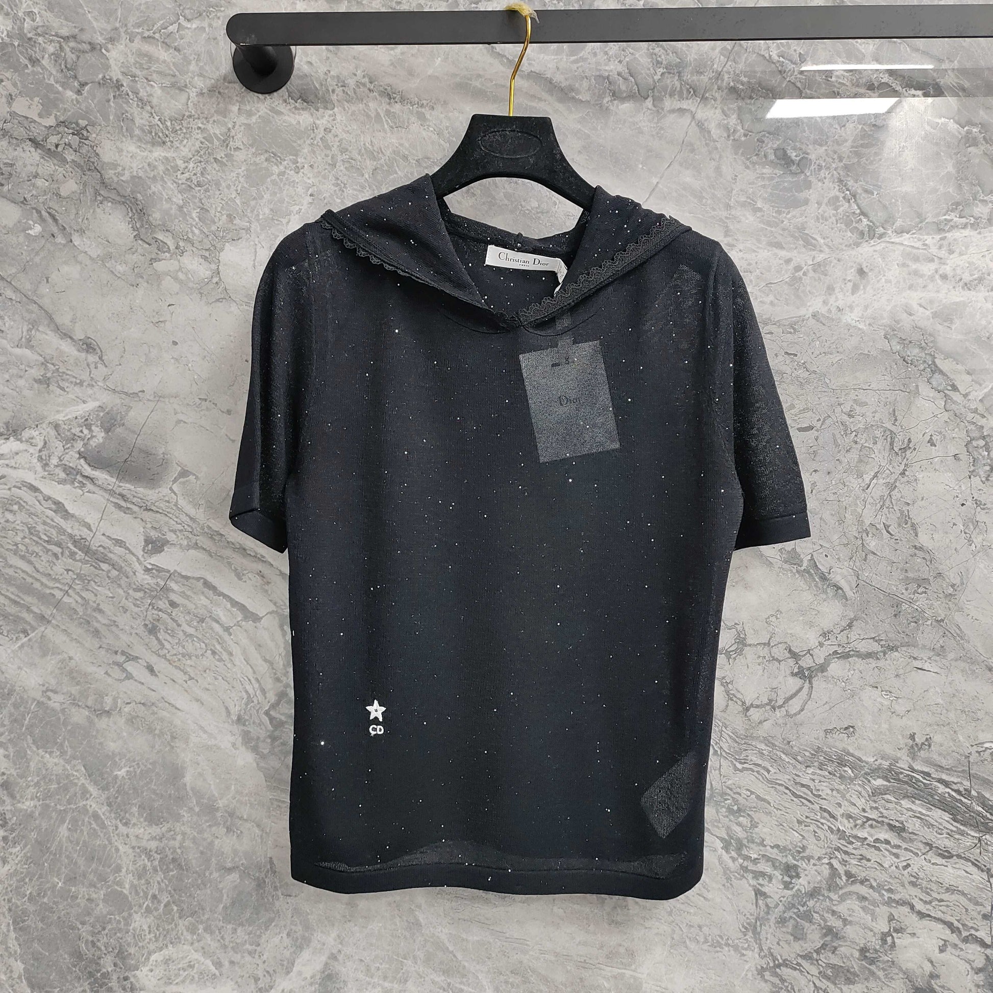Available in both classic black and pristine white, this top is a testament to Dior's iconic elegance. The short - sleeved design is perfect for transitional weather, offering a balance between coverage and breathability. The hood, adorned with delicate lace trim, adds a feminine and sophisticated touch, while also providing an extra layer of charm. The fabric is subtly embellished, with tiny details that catch the light, adding a hint of sparkle and refinement. The iconic Dior logo is discreetly placed, serving as a mark of authenticity and luxury.