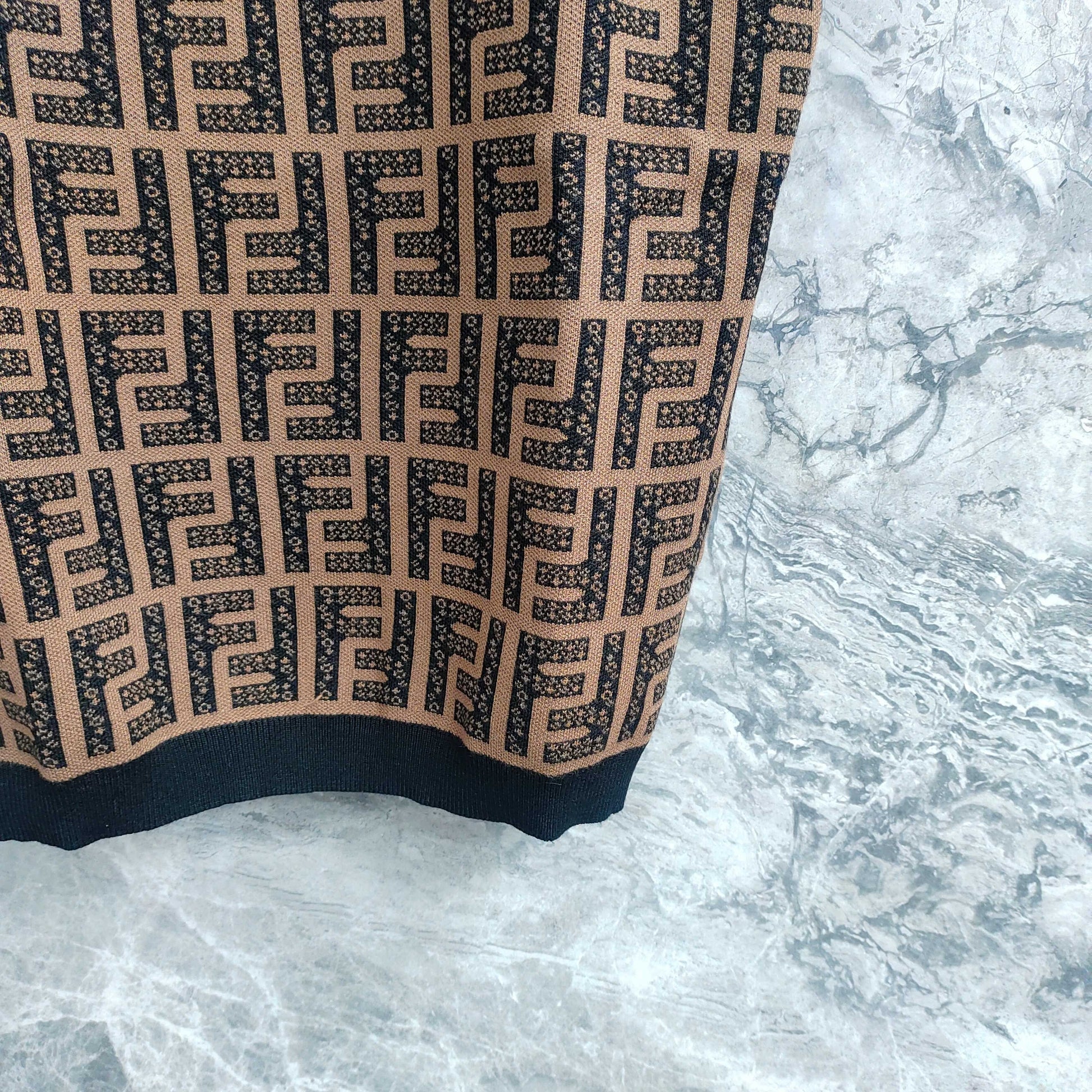 This T - shirt showcases Fendi's iconic double - F pattern, intricately woven in a striking brown and black color combination. The pattern, a hallmark of the brand's heritage, covers the entire garment, making a bold statement of sophistication and exclusivity. The round neckline and short sleeves offer a classic silhouette, while the black trim on the neckline, cuffs, and hem adds a sleek, modern contrast, enhancing the overall aesthetic.