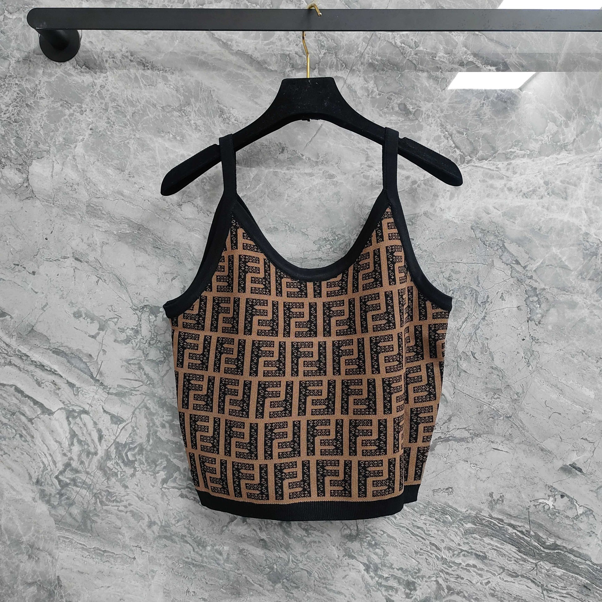 This vest proudly showcases Fendi's legendary double - F pattern, intricately interwoven in a striking brown and black color palette. The pattern, an emblem of the brand's heritage, covers the entire vest, making a bold statement of sophistication and exclusivity. The slender shoulder straps and scoop neckline create a flattering silhouette, while the black trim along the edges adds a sleek, modern contrast, enhancing the overall aesthetic.