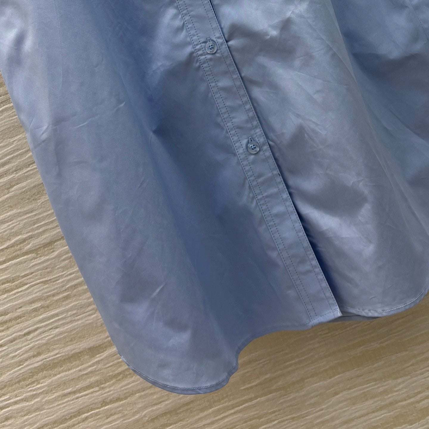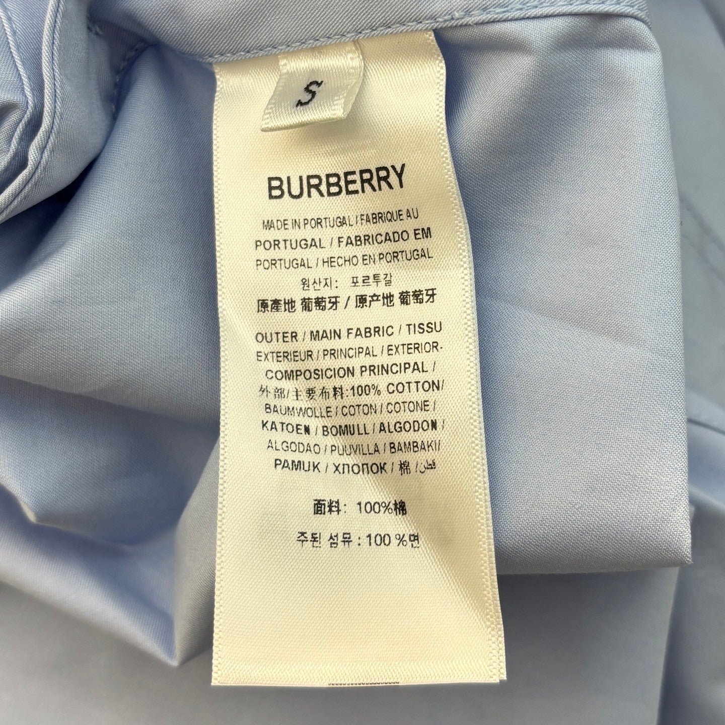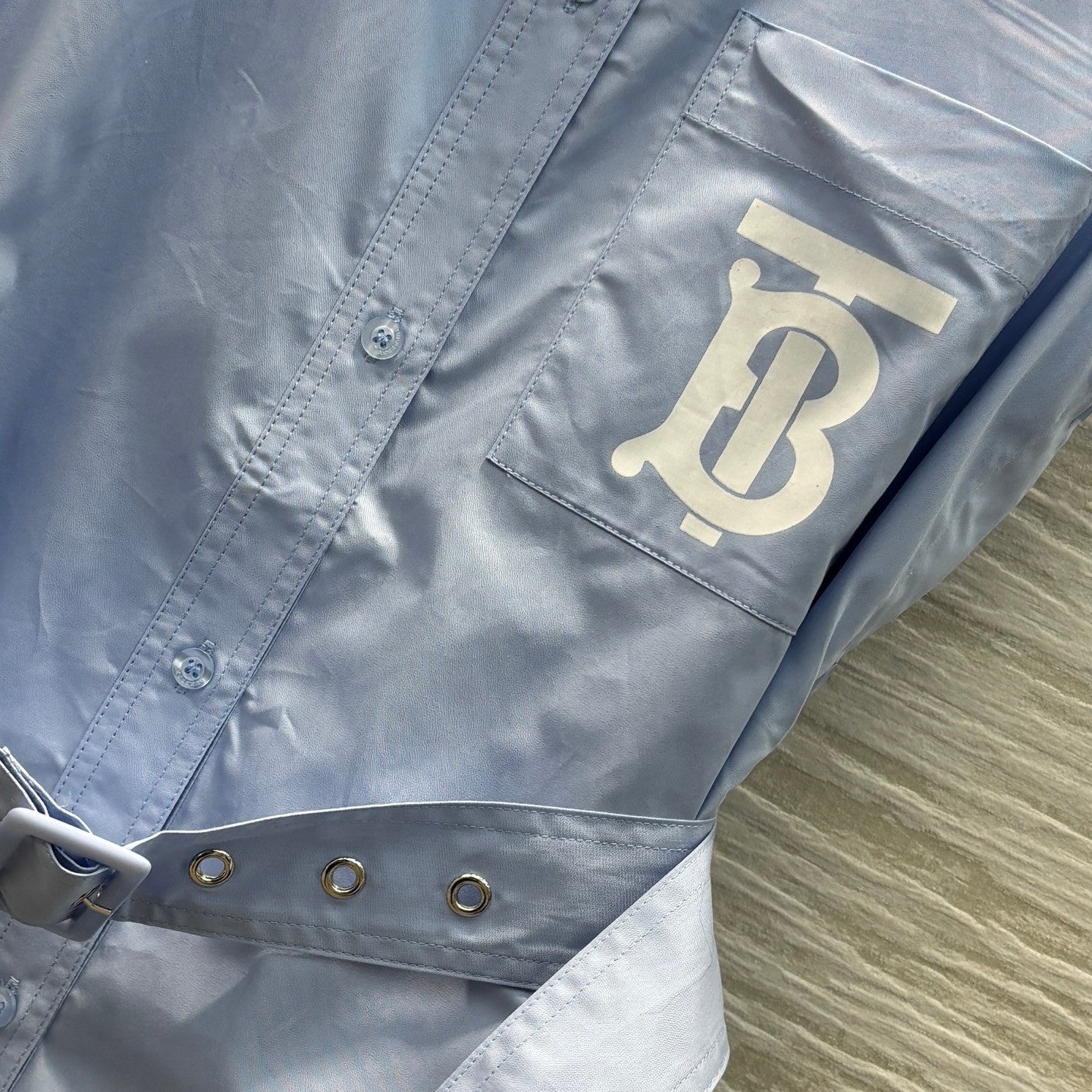 The dress comes in a soft, light blue hue that exudes a sense of calm and elegance. It features a stand - up collar and a front button placket, giving it a classic shirt - dress silhouette. The iconic Burberry logo is prominently displayed on the back and on the chest pocket, adding a touch of brand identity and sophistication.