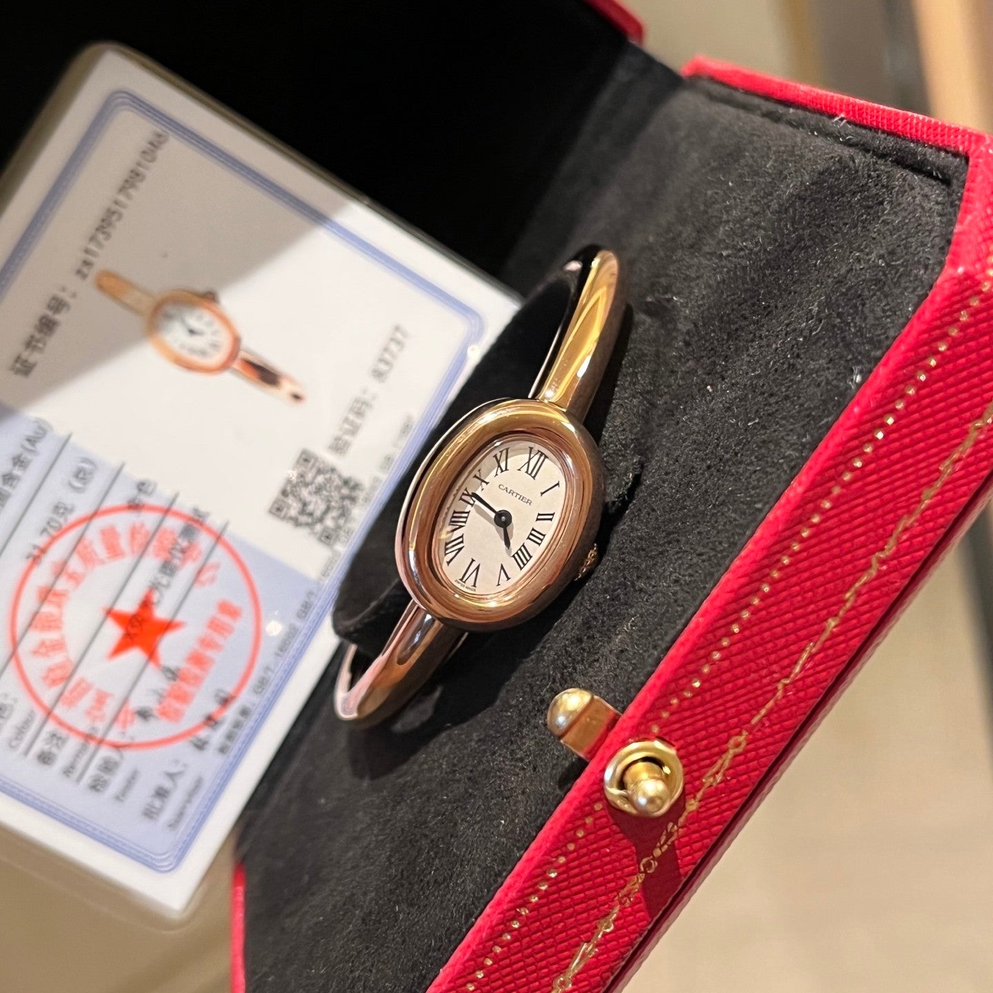 This watch doubles as a bracelet, being小巧别致 yet eye - catching. It exudes a sense of luxury within its stylish design. You'll be surprised when you hold it in your hand for its high aesthetic value! The elliptical shape resembles an elegant European - style bathtub, and it's so beautiful! The Baignoire collection wristwatch, with its soft lines, lugs, and noble temperament, gives the watch an extremely balanced appearance. This timeless and classic watch fully showcases French elegance and is deeply favored by women. The small - sized model is equipped with an original Swiss - imported quartz movement. The case is made of gold - plated stainless steel, with sword - shaped blue - steel hands. Cartier reinterprets the traditional round - shaped wristwatch, stretching the circle into an ellipse. Inspired by the simple and geometric - featured oval, the watch adopts a plump and rounded elliptical profile, fully demonstrating a gentle charm.