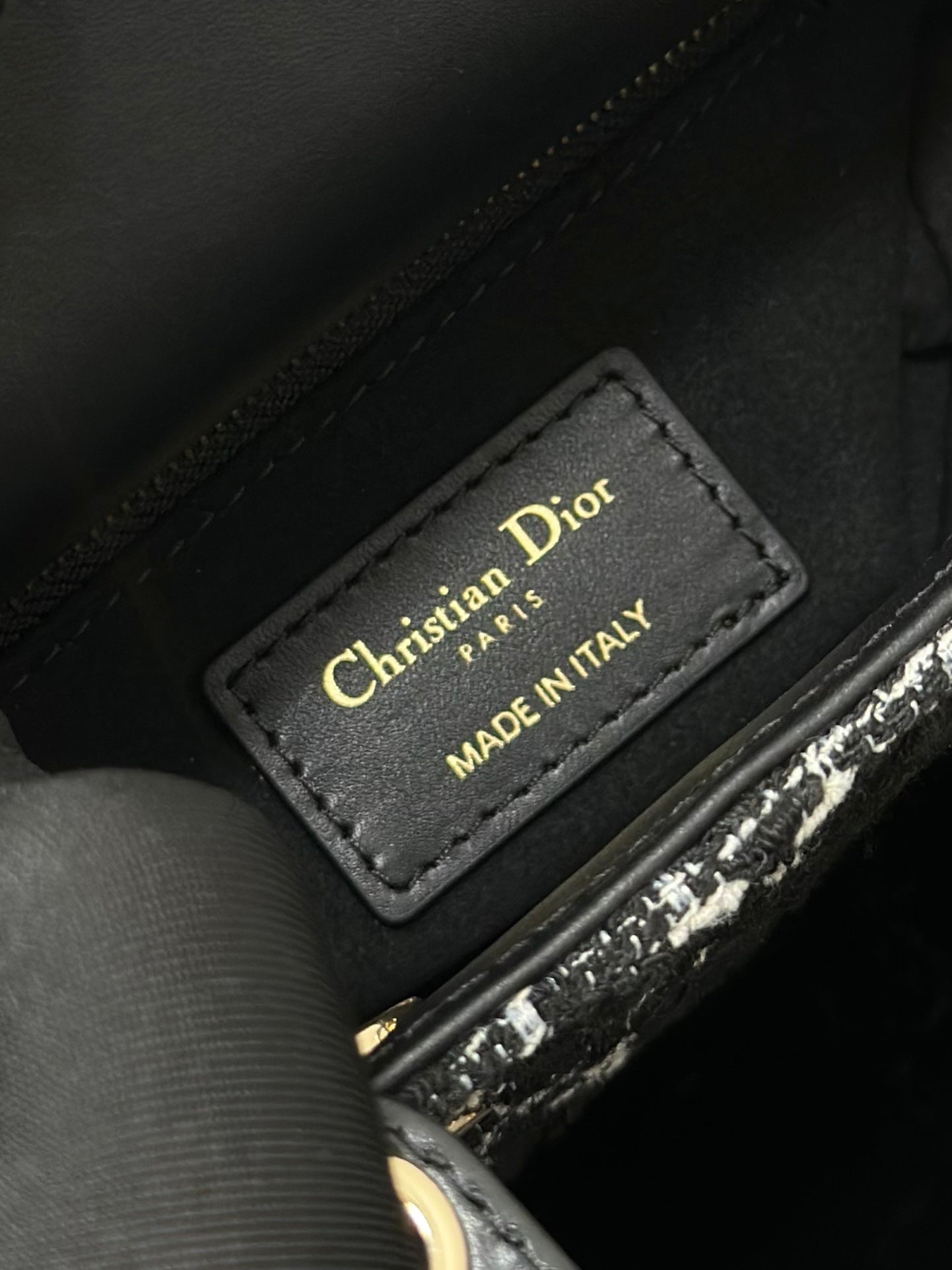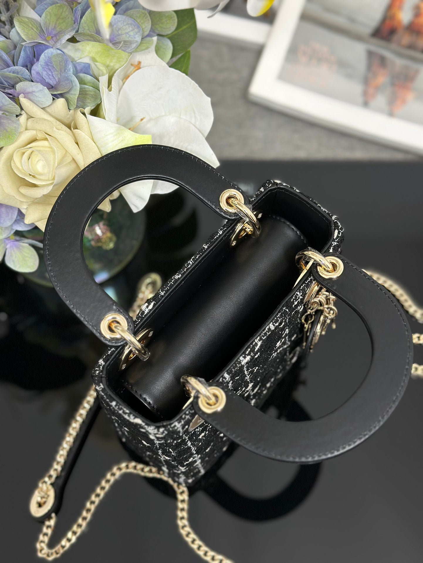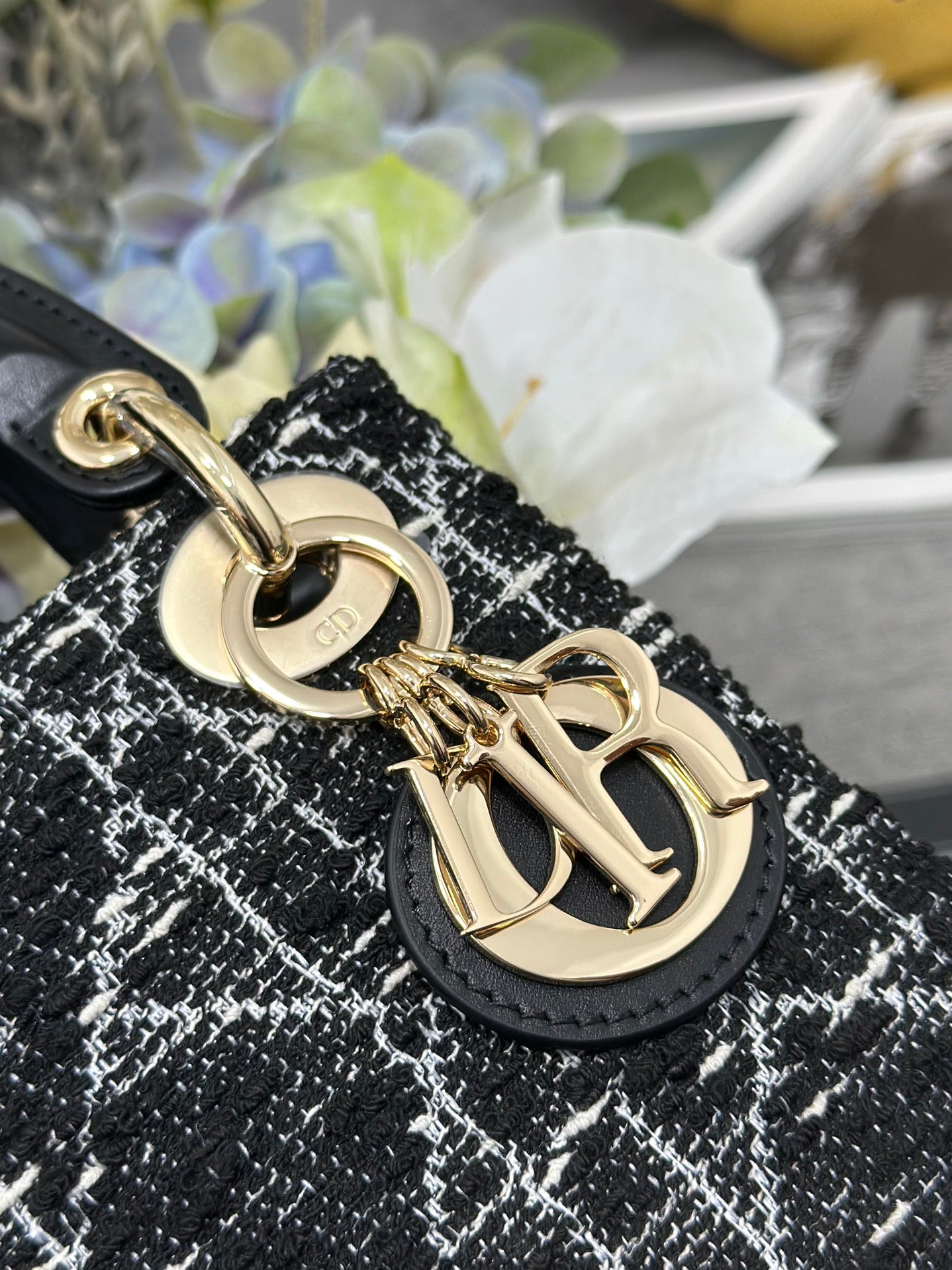 The handbag features a three - grid structure crafted from premium tweed fabric, showcasing a textured pattern that exudes a sense of understated luxury. The contrast between the black and white tweed creates a visually appealing aesthetic, while the black leather handle adds a touch of sophistication. The iconic gold - toned hardware, including the "D.I.O.R" charms, enhances the bag's classic appeal, making it a statement piece for any outfit.