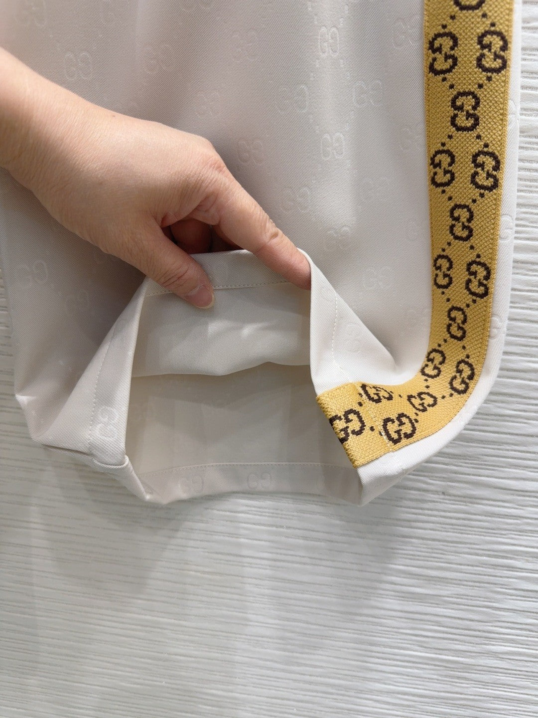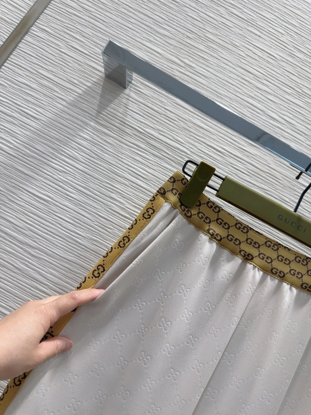 Crafted from 100% polyester, these trousers offer a smooth and luxurious feel. The body of the trousers features an elegant white base adorned with a subtle Gucci logo print, exuding understated sophistication. The waistband and side stripes are the true showstoppers, showcasing Gucci's iconic monogram pattern in a rich, contrasting color. This not only adds a bold statement element but also pays homage to the brand's heritage.