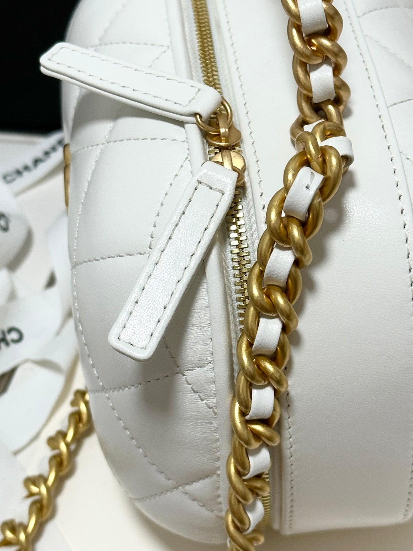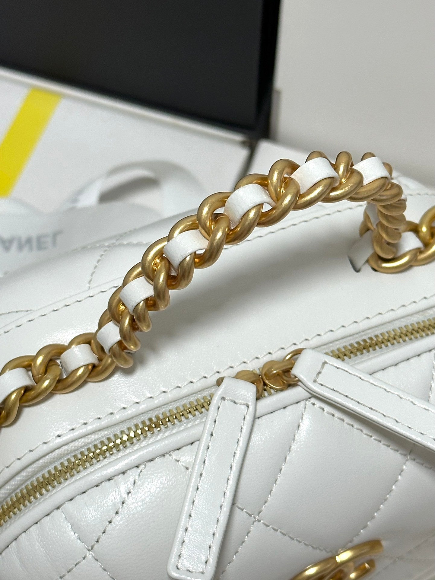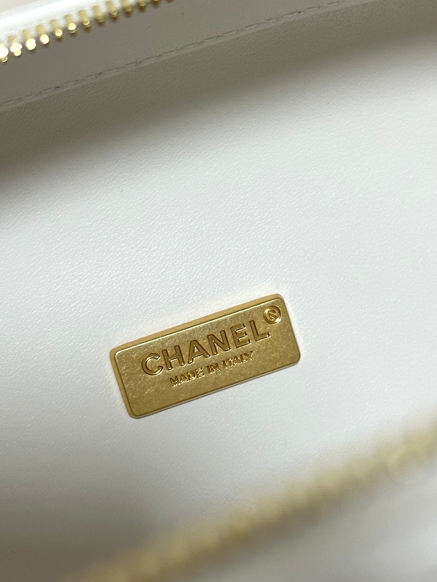 Elevate your beauty routine with this Chanel - inspired round box - shaped chain - strap fashion makeup bag. Its sleek black quilted exterior, adorned with the iconic CC logo, exudes timeless elegance and luxury.